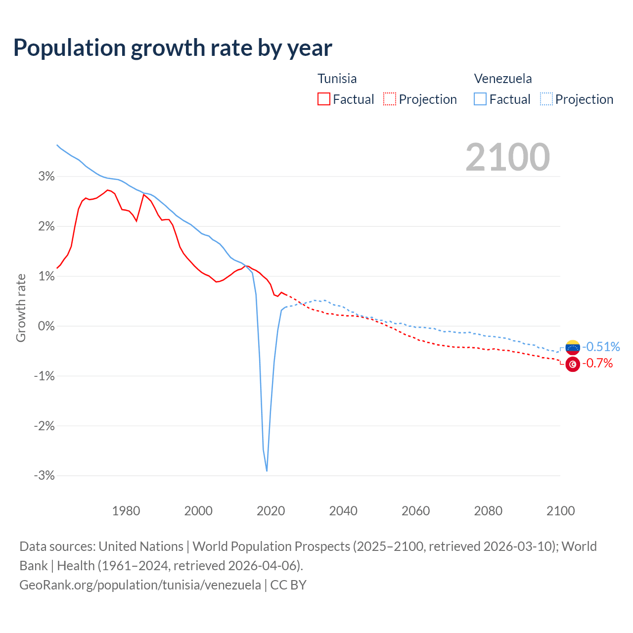- For the last 10 years, Tunisia has had an average growth rate of +0.89% per year vs -0.46% in Venezuela.