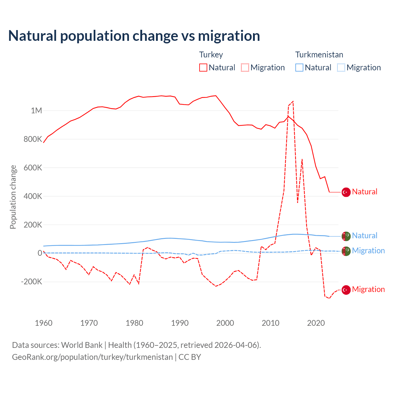 Over the last 10 years, 73% of the population change in Turkey is from natural causes (a gain of 7,333,352 people) and 27% is from migration (a gain of 2,718,916 people). In Turkmenistan 89.2% is from natural causes (a gain of 1,270,228 people) and 10.8% is from migration (a gain of 154,379 people).