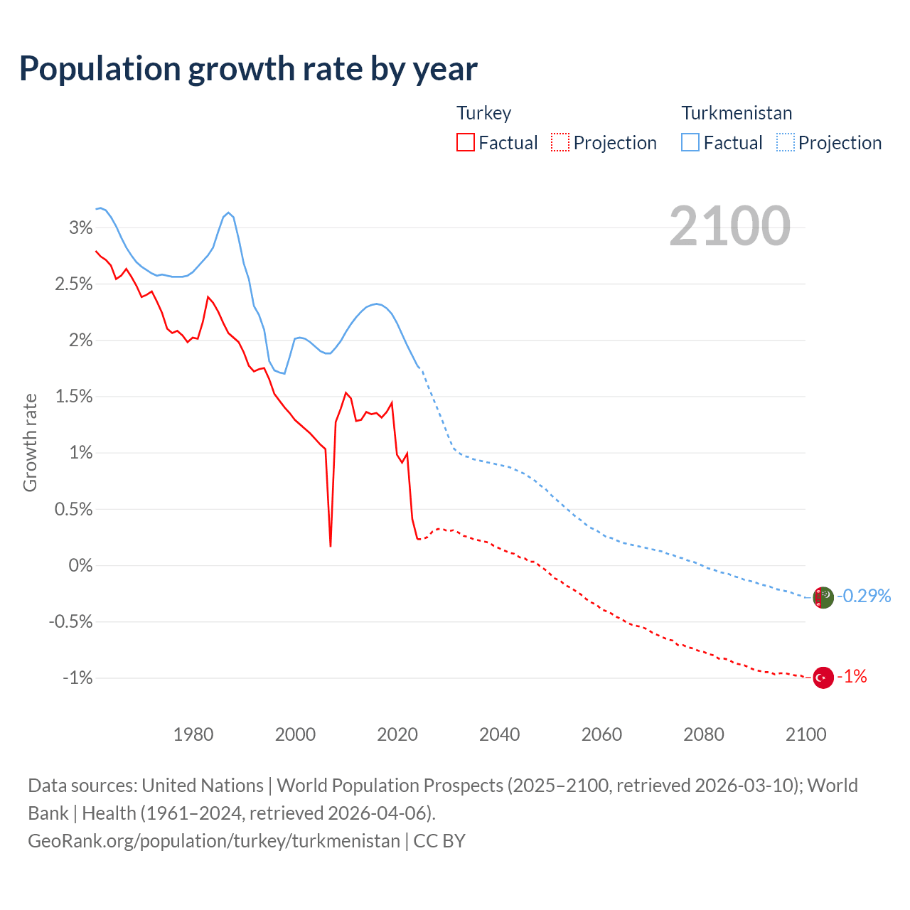 - For the last 10 years, Turkey has had an average growth rate of +1.06% per year vs +2.14% in Turkmenistan.