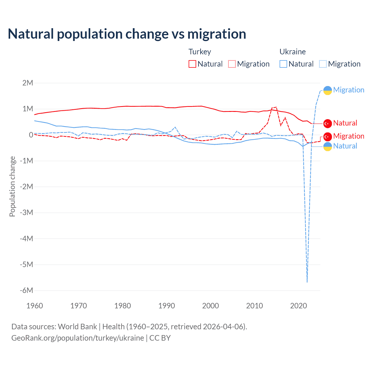 Over the last 10 years, 73% of the population change in Turkey is from natural causes (a gain of 7,333,352 people) and 27% is from migration (a gain of 2,718,916 people). In Ukraine 28.2% is from natural causes (a loss of 2,435,153 people) and 71.8% is from migration (a loss of 6,198,995 people).