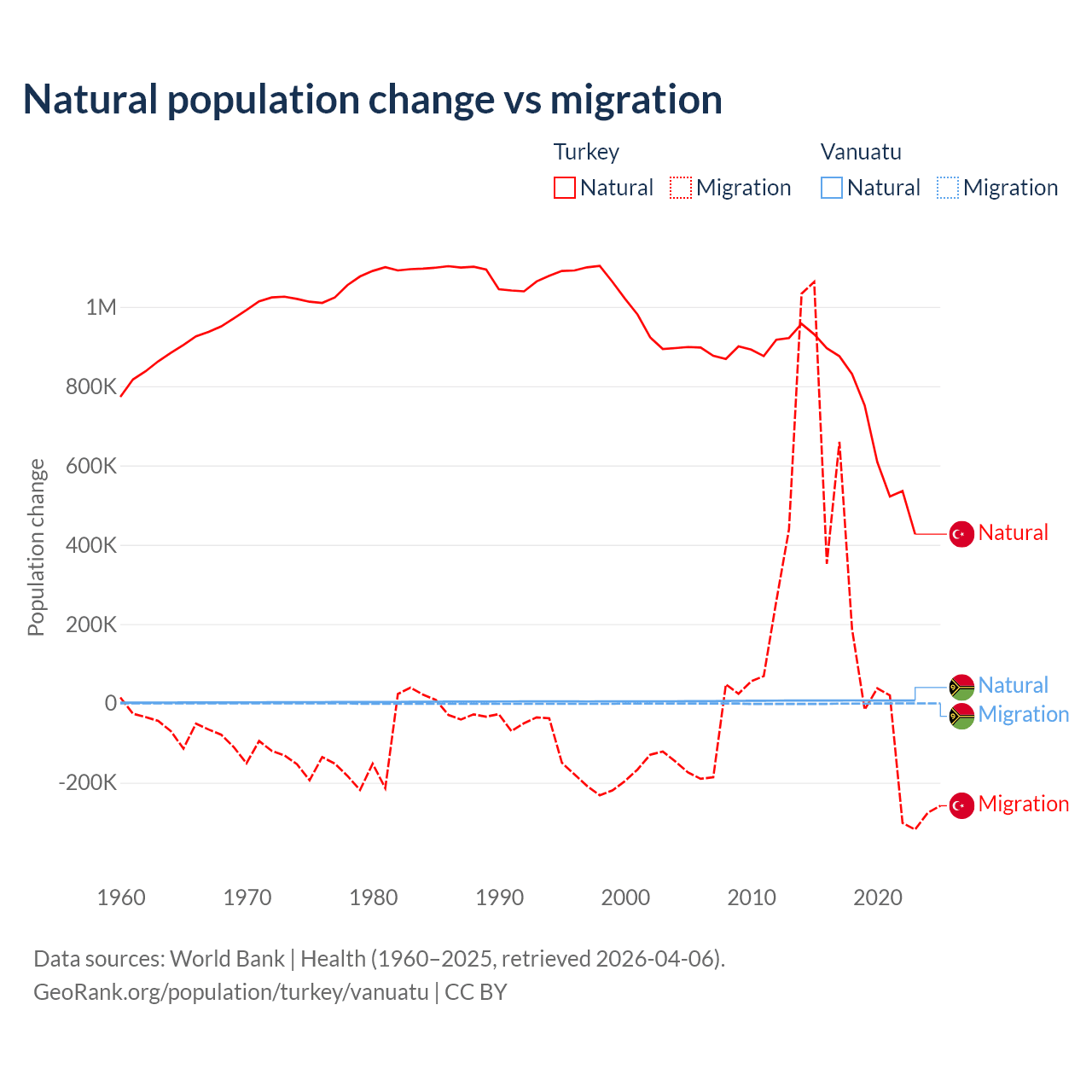 Over the last 10 years, 73% of the population change in Turkey is from natural causes (a gain of 7,333,352 people) and 27% is from migration (a gain of 2,718,916 people). In Vanuatu 92.2% is from natural causes (a gain of 72,941 people) and 7.81% is from migration (a loss of 6,181 people).
