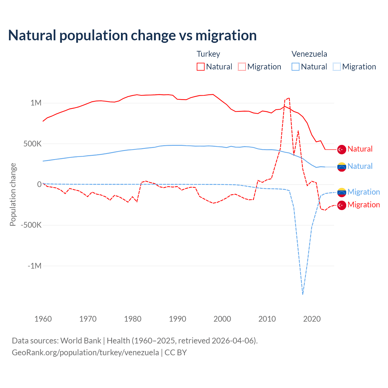 Over the last 10 years, 73% of the population change in Turkey is from natural causes (a gain of 7,333,352 people) and 27% is from migration (a gain of 2,718,916 people). In Venezuela 38.6% is from natural causes (a gain of 2,946,257 people) and 61.4% is from migration (a loss of 4,683,227 people).