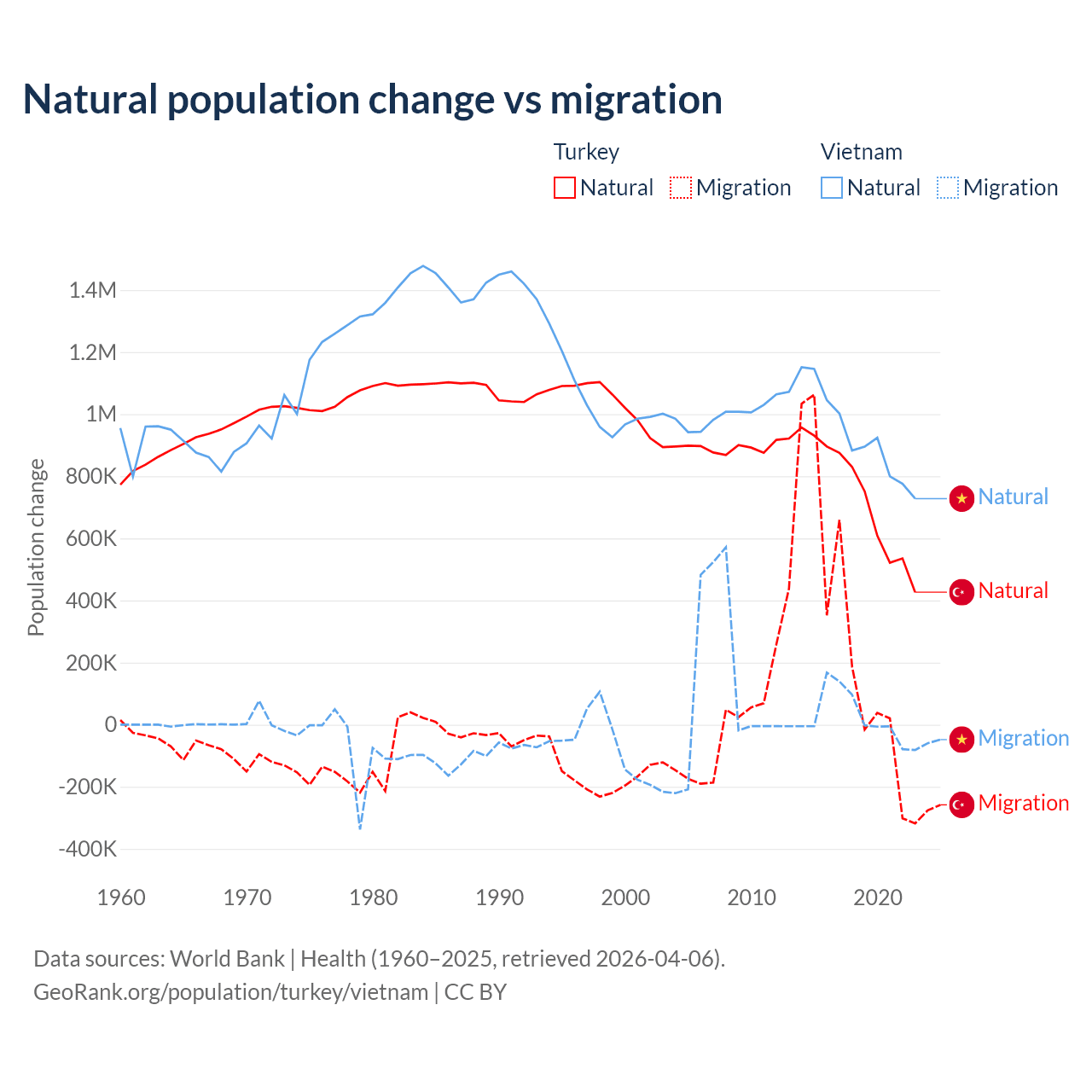 Over the last 10 years, 73% of the population change in Turkey is from natural causes (a gain of 7,333,352 people) and 27% is from migration (a gain of 2,718,916 people). In Vietnam 97.7% is from natural causes (a gain of 9,349,756 people) and 2.29% is from migration (a gain of 219,073 people).