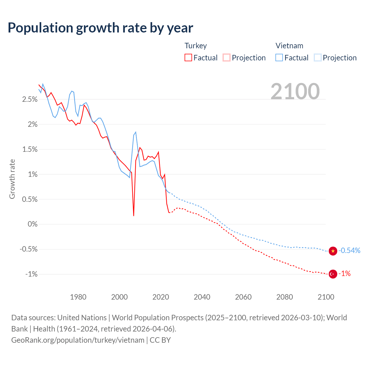 - For the last 10 years, Turkey has had an average growth rate of +1.06% per year vs +0.99% in Vietnam.