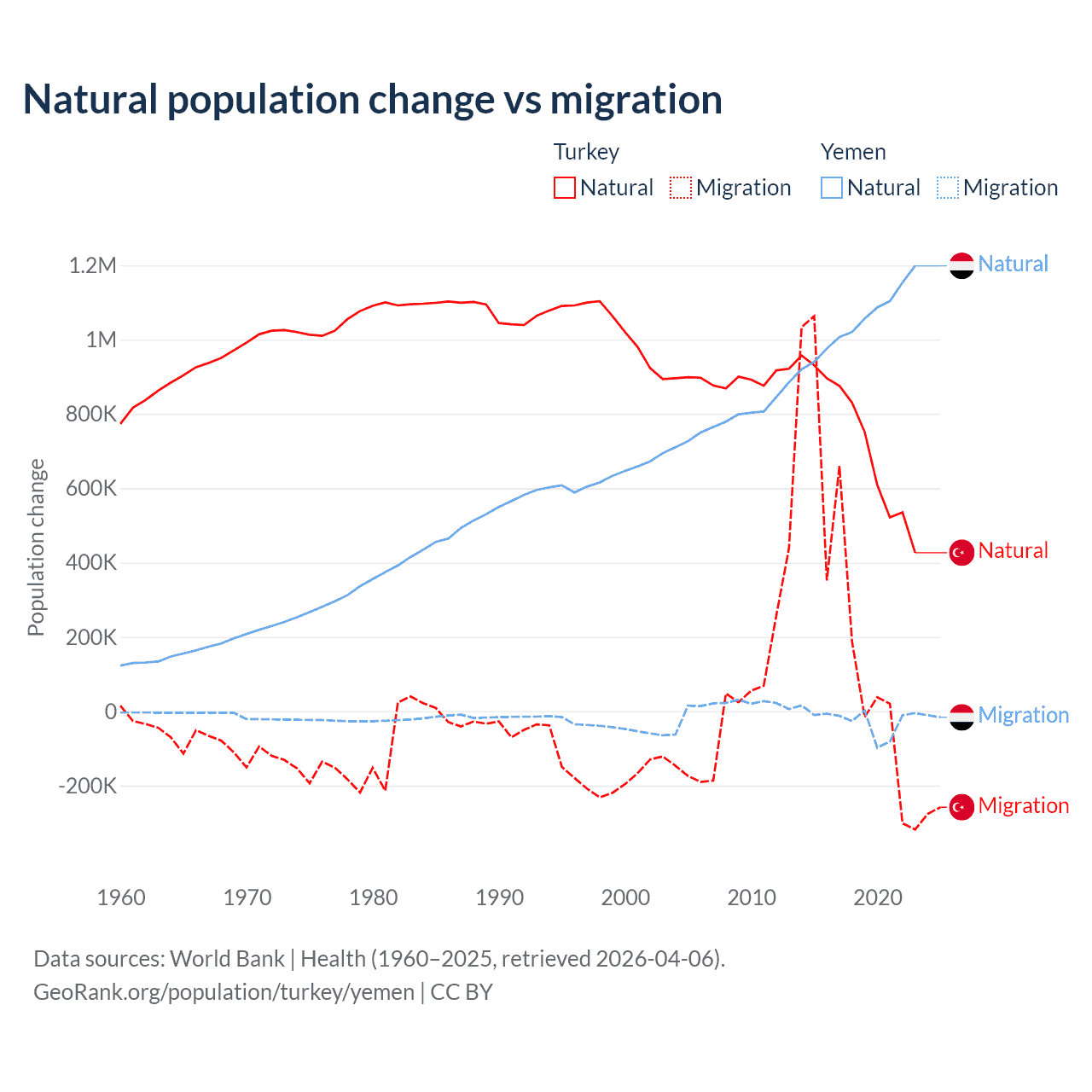 Over the last 10 years, 73% of the population change in Turkey is from natural causes (a gain of 7,333,352 people) and 27% is from migration (a gain of 2,718,916 people). In Yemen 97.8% is from natural causes (a gain of 10,460,813 people) and 2.17% is from migration (a loss of 231,814 people).