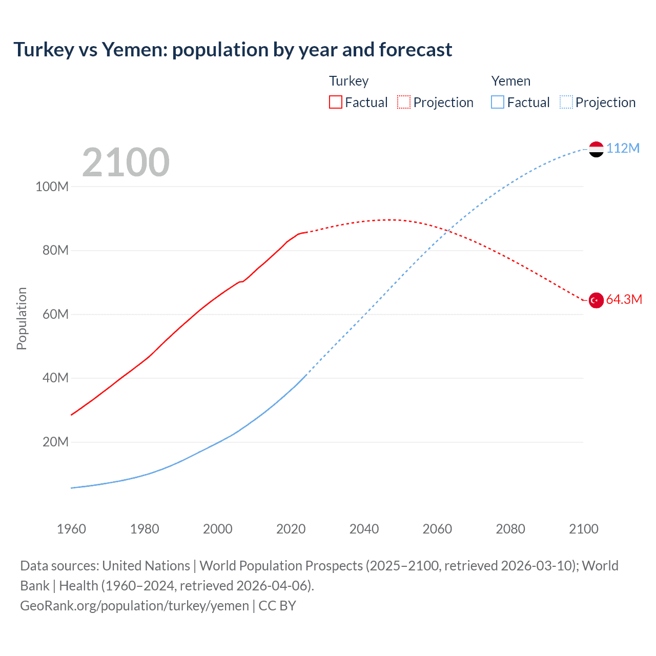 The latest officially reported population of Turkey was 85,518,661 in 2024 vs 40,583,164 people in Yemen in 2024. In 2026, based on the adjusted UN estimation, the current Turkey's population is 86,002,379 people compared to 43,325,643 in Yemen.
