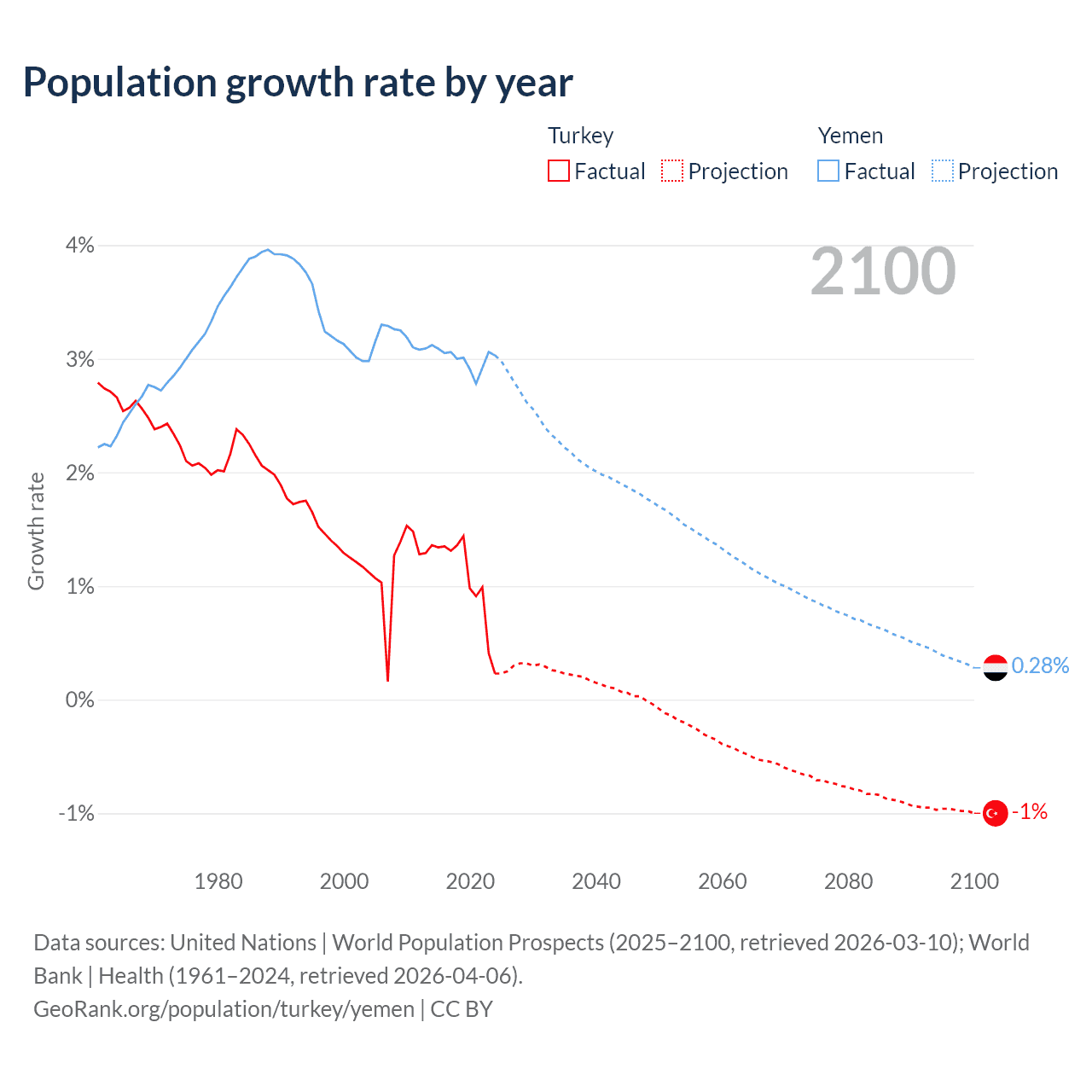 - For the last 10 years, Turkey has had an average growth rate of +1.06% per year vs +3% in Yemen.