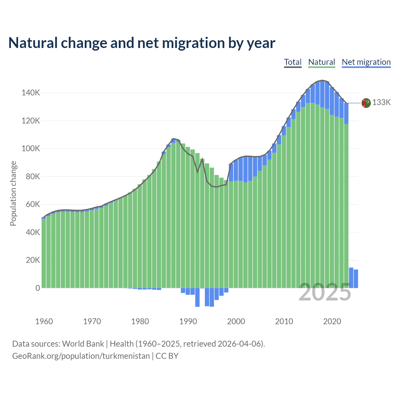 Over the last 10 years, 89.2% of the population change in Turkmenistan is from natural causes (a gain of 1,270,228 people) and 10.8% is from migration (a gain of 154,379 people).