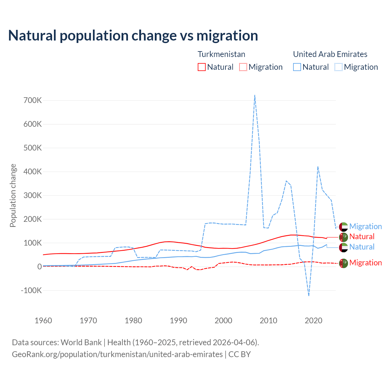 Over the last 10 years, 89.2% of the population change in Turkmenistan is from natural causes (a gain of 1,270,228 people) and 10.8% is from migration (a gain of 154,379 people). In the United Arab Emirates 30.5% is from natural causes (a gain of 857,996 people) and 69.5% is from migration (a gain of 1,958,520 people).