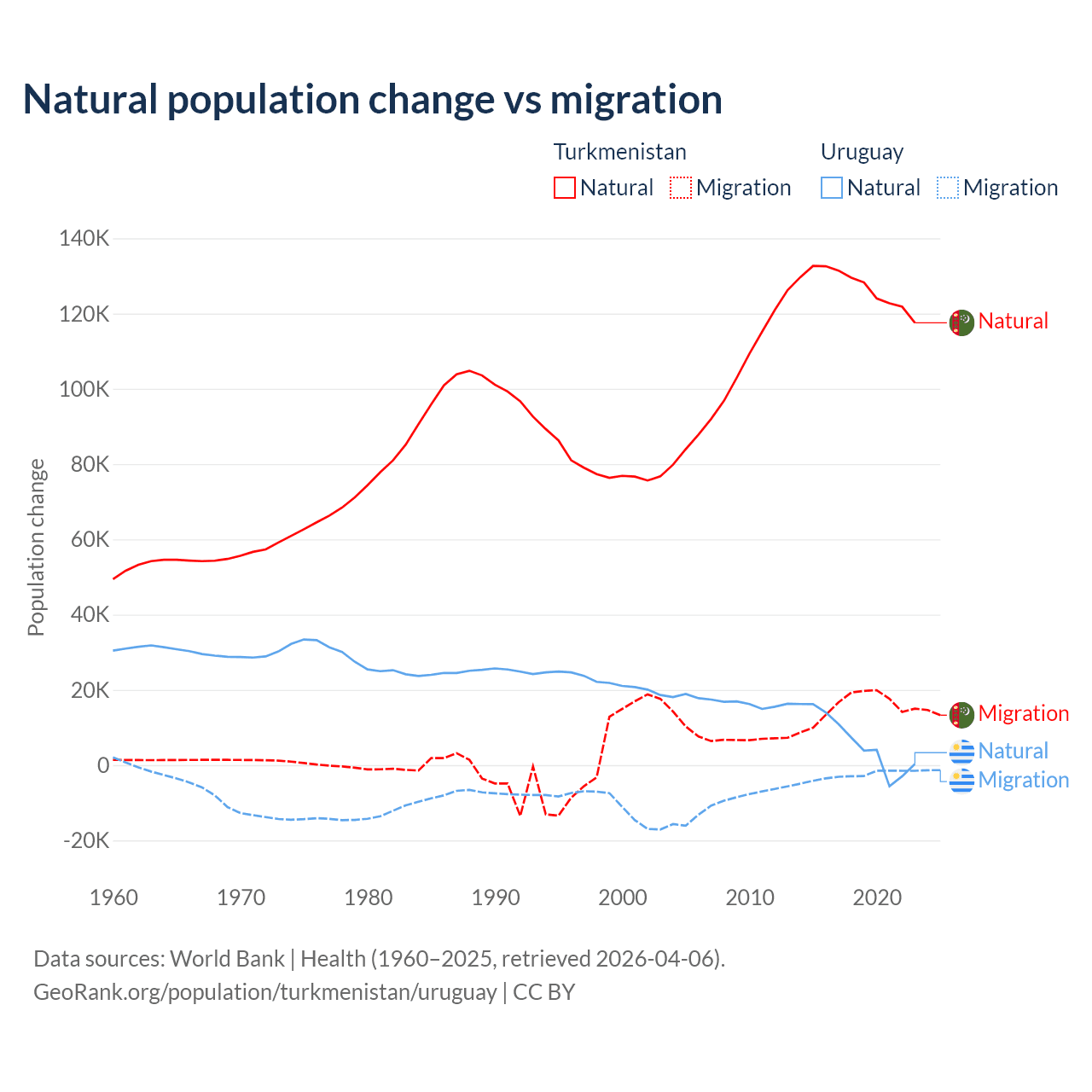 Over the last 10 years, 89.2% of the population change in Turkmenistan is from natural causes (a gain of 1,270,228 people) and 10.8% is from migration (a gain of 154,379 people). In Uruguay 70% is from natural causes (a gain of 64,303 people) and 30% is from migration (a loss of 27,501 people).