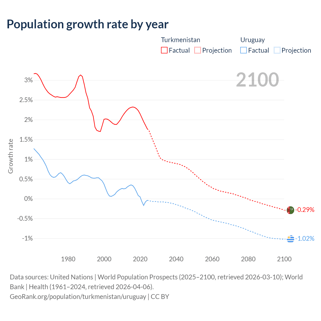 - For the last 10 years, Turkmenistan has had an average growth rate of +2.14% per year vs +0.11% in Uruguay.