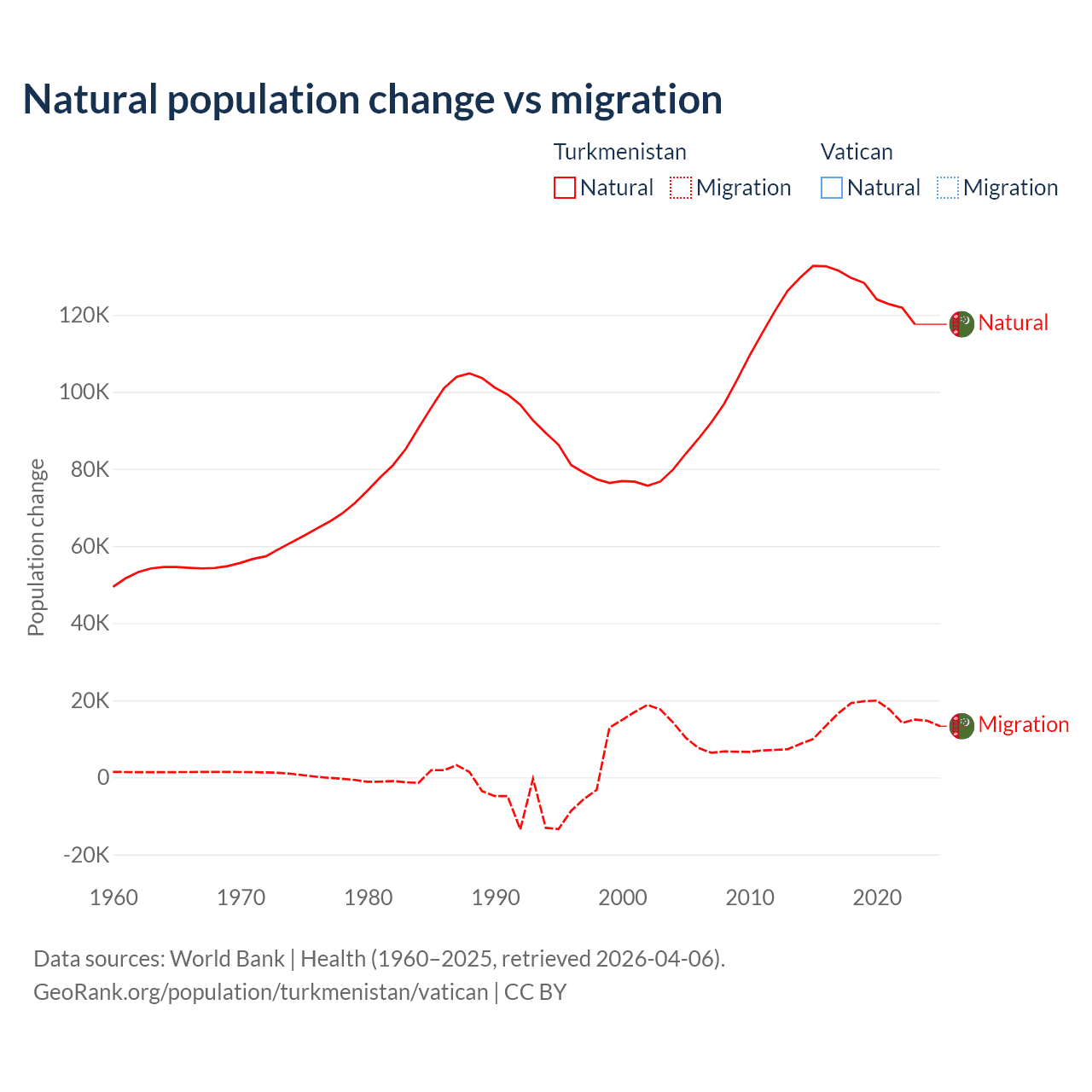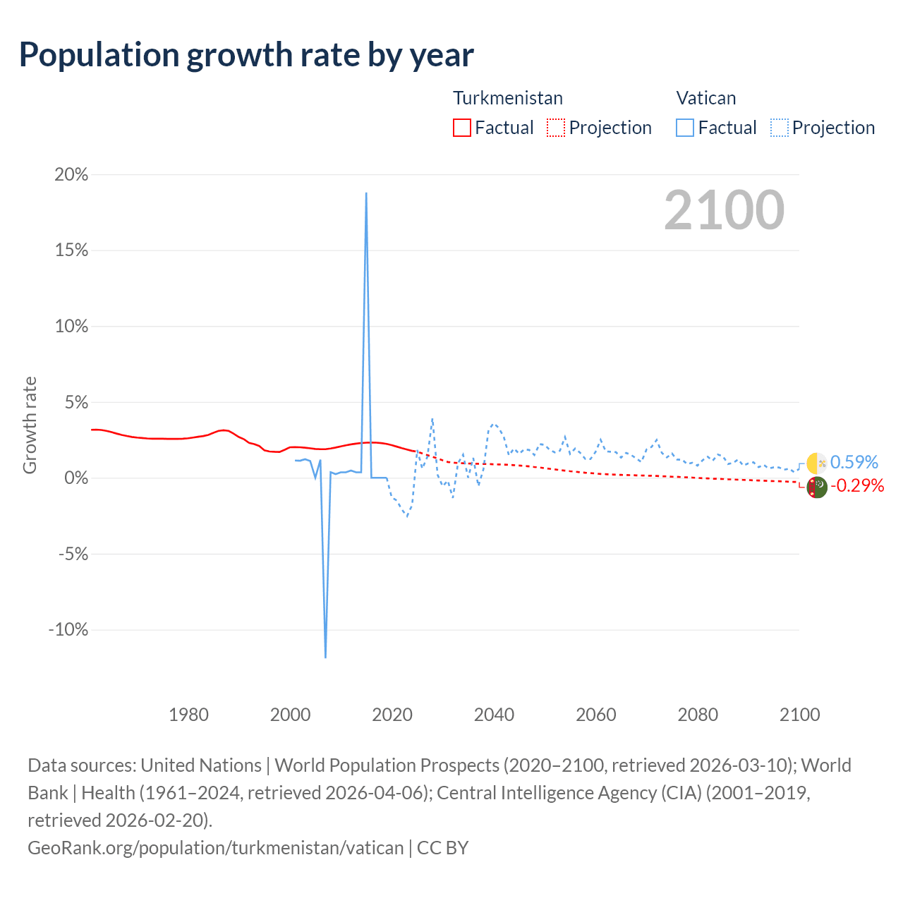 - For the last 10 years, Turkmenistan has had an average growth rate of +2.14% per year vs +1.9% in the Vatican.