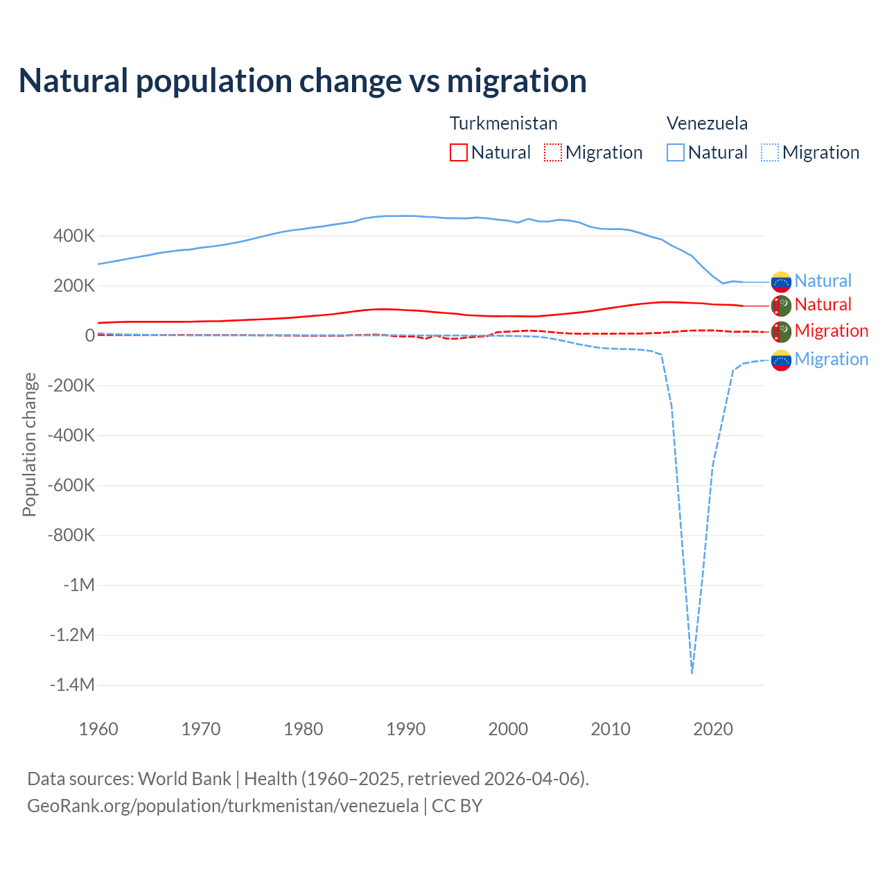 Over the last 10 years, 89.2% of the population change in Turkmenistan is from natural causes (a gain of 1,270,228 people) and 10.8% is from migration (a gain of 154,379 people). In Venezuela 38.6% is from natural causes (a gain of 2,946,257 people) and 61.4% is from migration (a loss of 4,683,227 people).