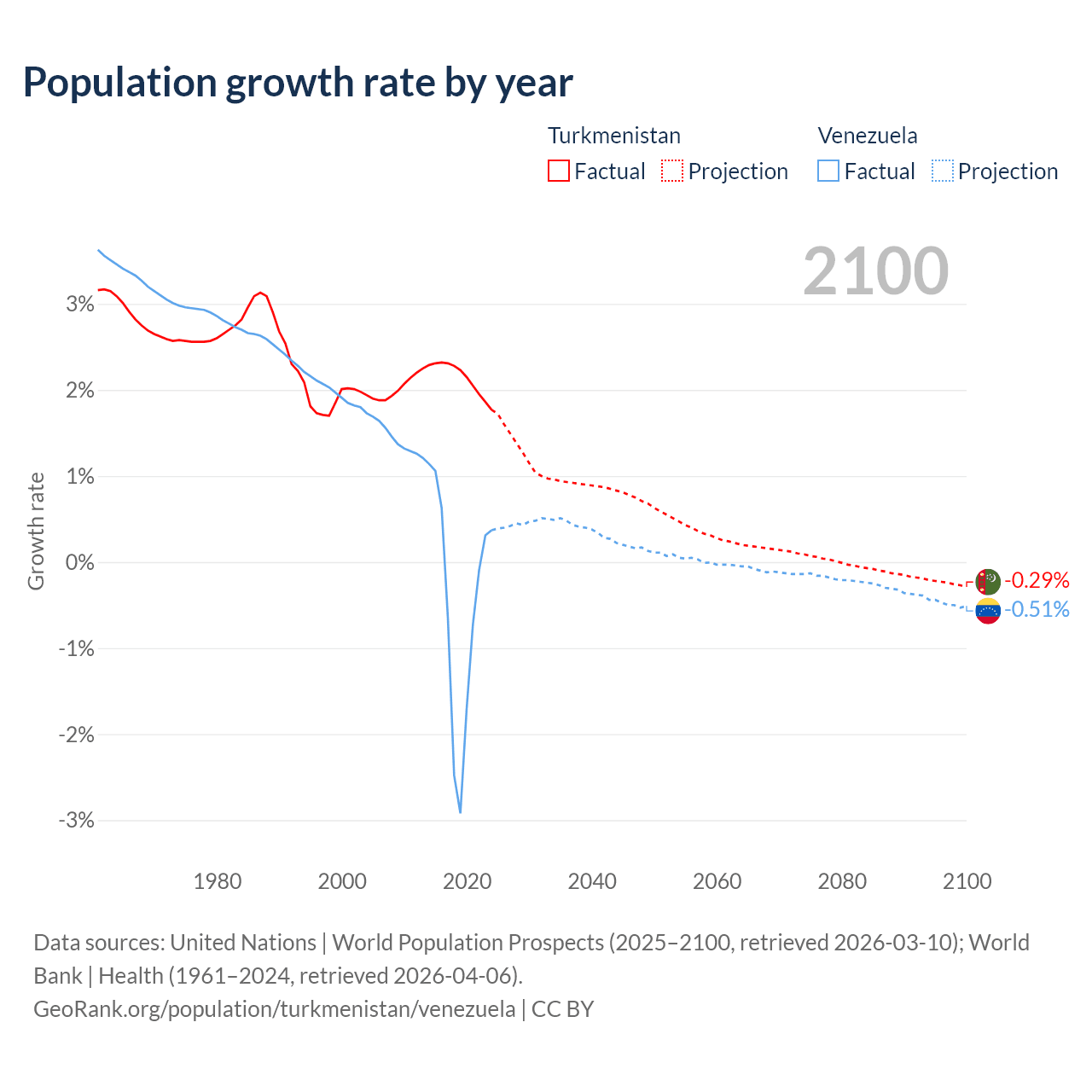 - For the last 10 years, Turkmenistan has had an average growth rate of +2.14% per year vs -0.46% in Venezuela.