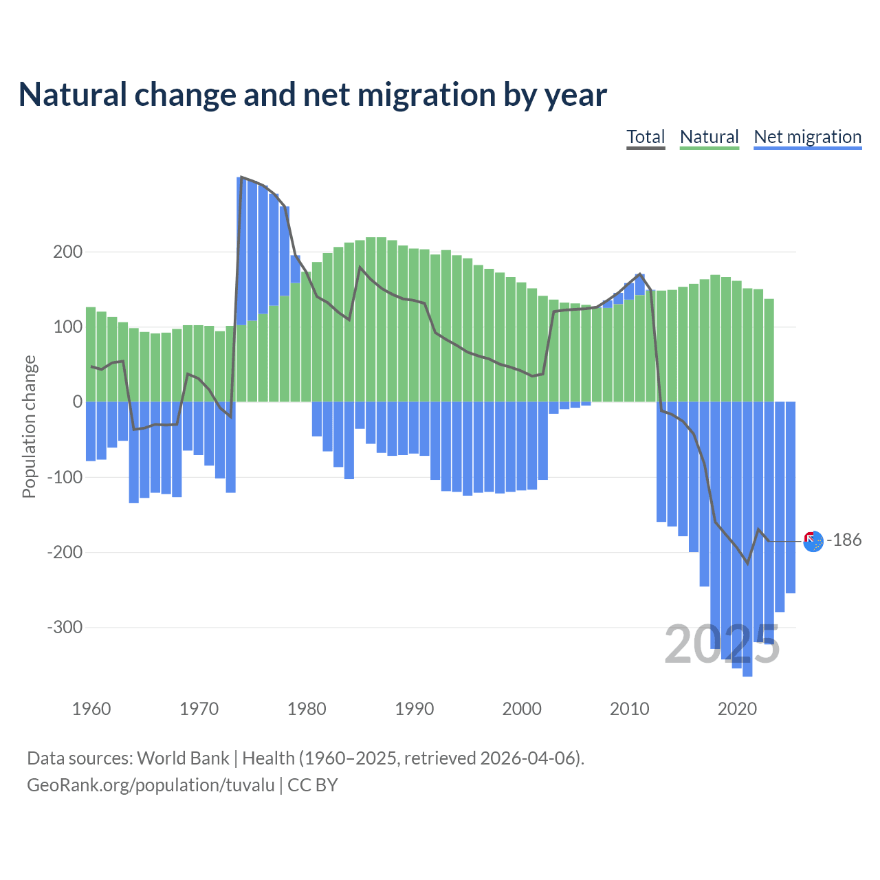 Over the last 10 years, 35.5% of the population change in Tuvalu is from natural causes (a gain of 1,556 people) and 64.5% is from migration (a loss of 2,827 people).