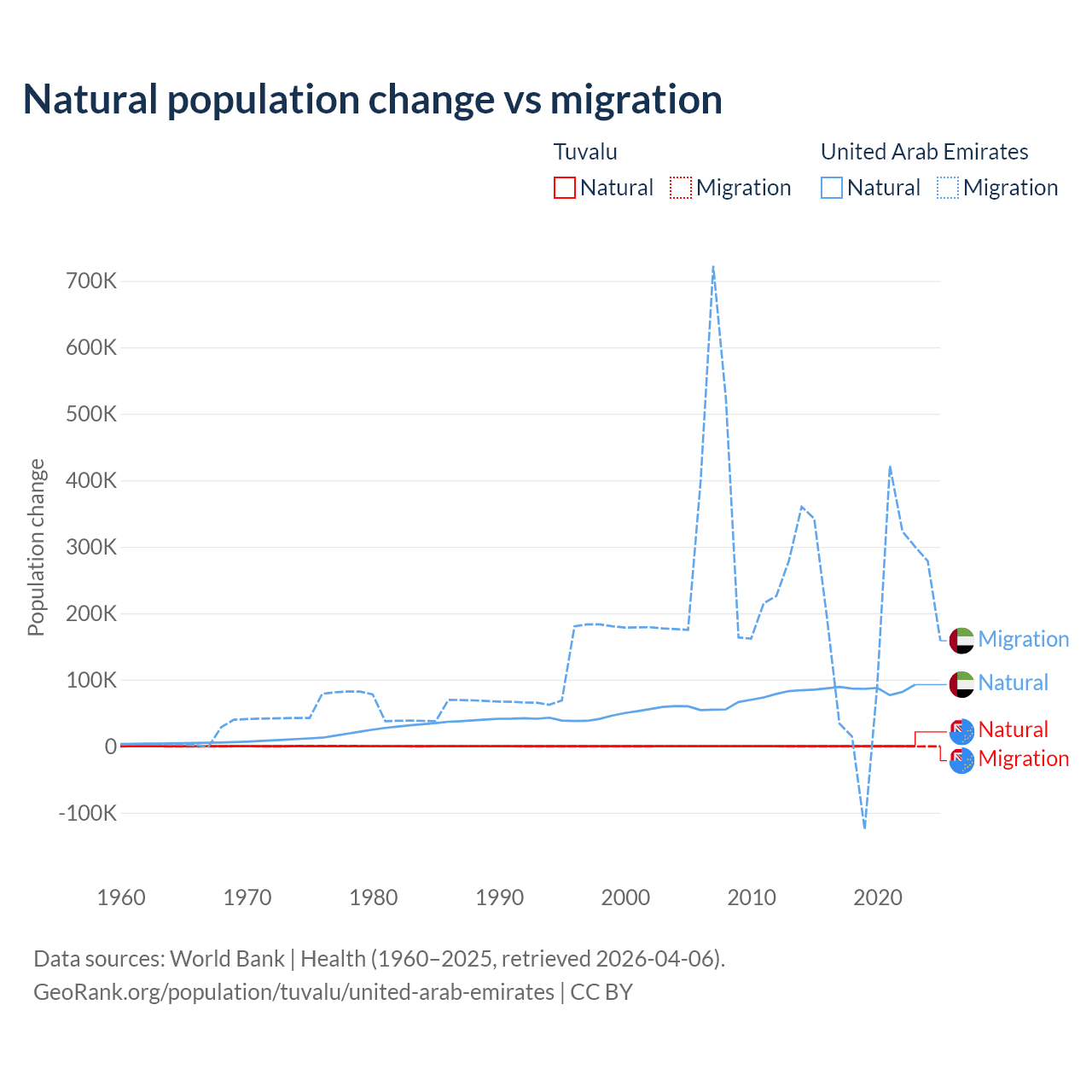 Over the last 10 years, 35.5% of the population change in Tuvalu is from natural causes (a gain of 1,556 people) and 64.5% is from migration (a loss of 2,827 people). In the United Arab Emirates 30.5% is from natural causes (a gain of 857,996 people) and 69.5% is from migration (a gain of 1,958,520 people).