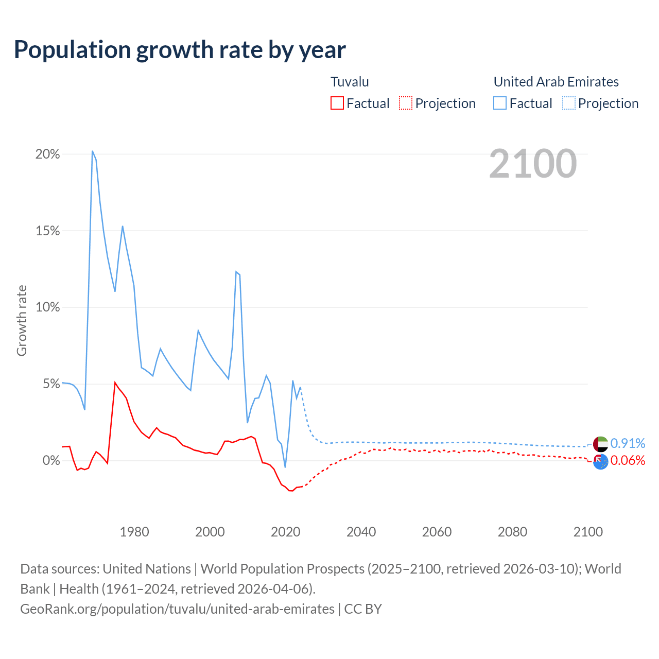 - For the last 10 years, Tuvalu has had an average growth rate of -1.19% per year vs +3.31% in the United Arab Emirates.
