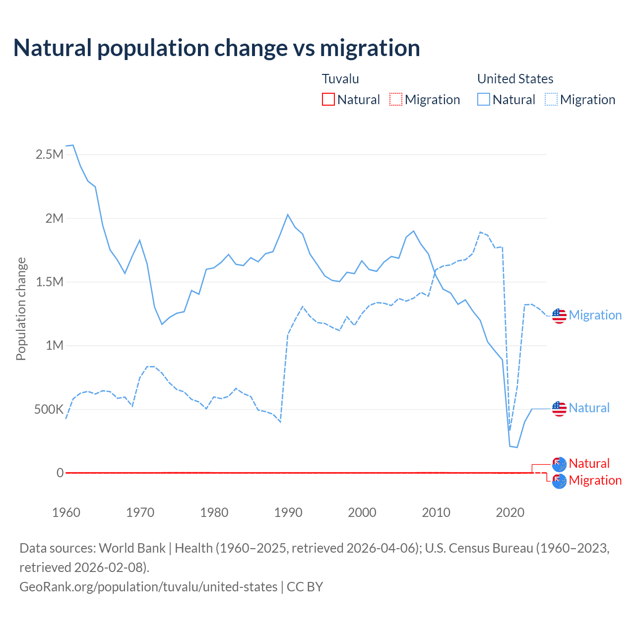 Over the last 10 years, 35.5% of the population change in Tuvalu is from natural causes (a gain of 1,556 people) and 64.5% is from migration (a loss of 2,827 people). In the United States 35.8% is from natural causes (a gain of 8,005,866 people) and 64.2% is from migration (a gain of 14,334,286 people).