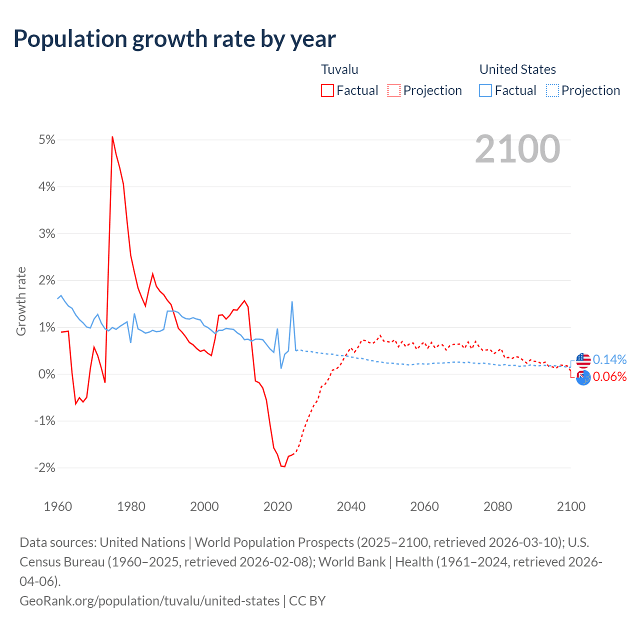 - For the last 10 years, Tuvalu has had an average growth rate of -1.19% per year vs +0.65% in the United States.