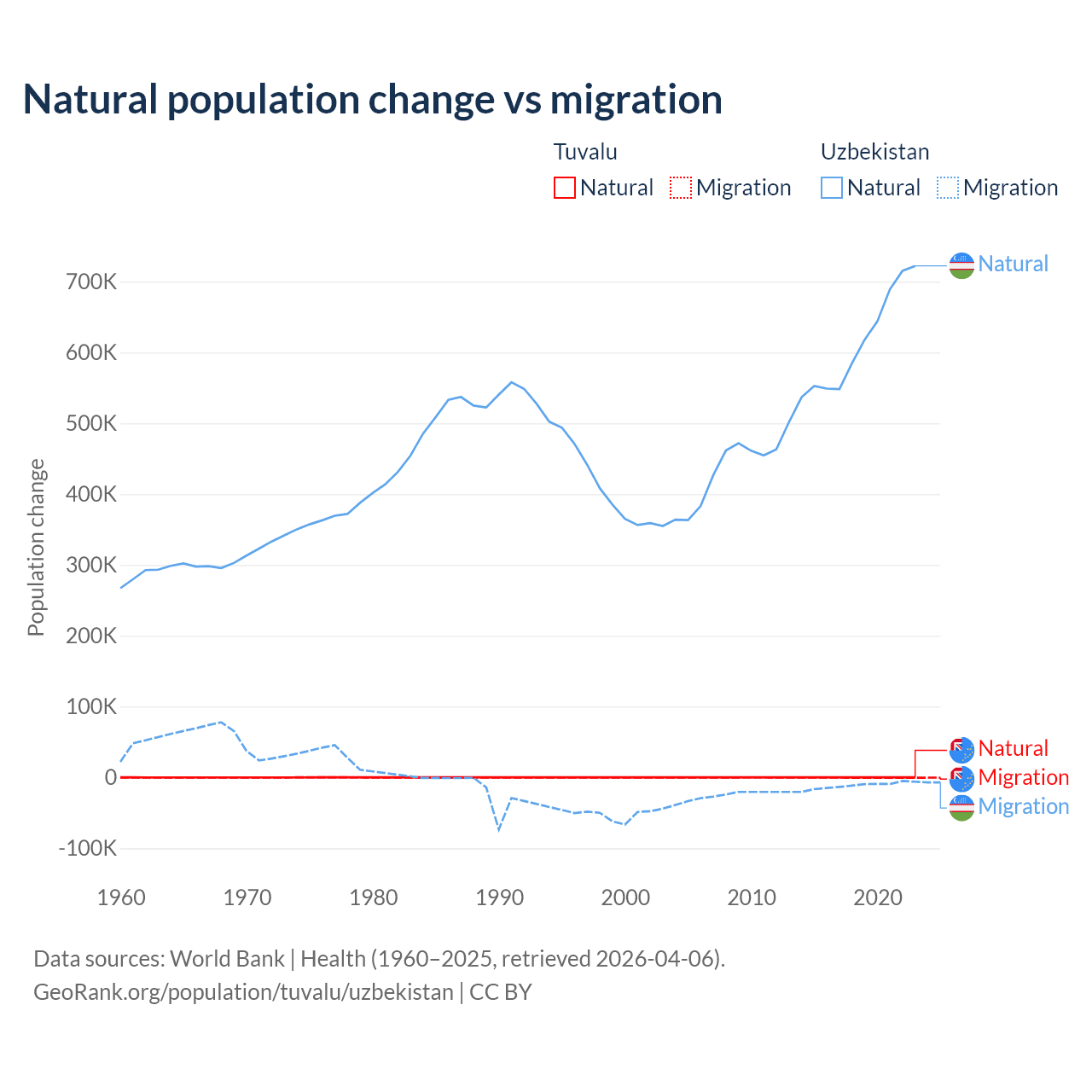 Over the last 10 years, 35.5% of the population change in Tuvalu is from natural causes (a gain of 1,556 people) and 64.5% is from migration (a loss of 2,827 people). In Uzbekistan 98.2% is from natural causes (a gain of 6,161,117 people) and 1.84% is from migration (a loss of 115,398 people).
