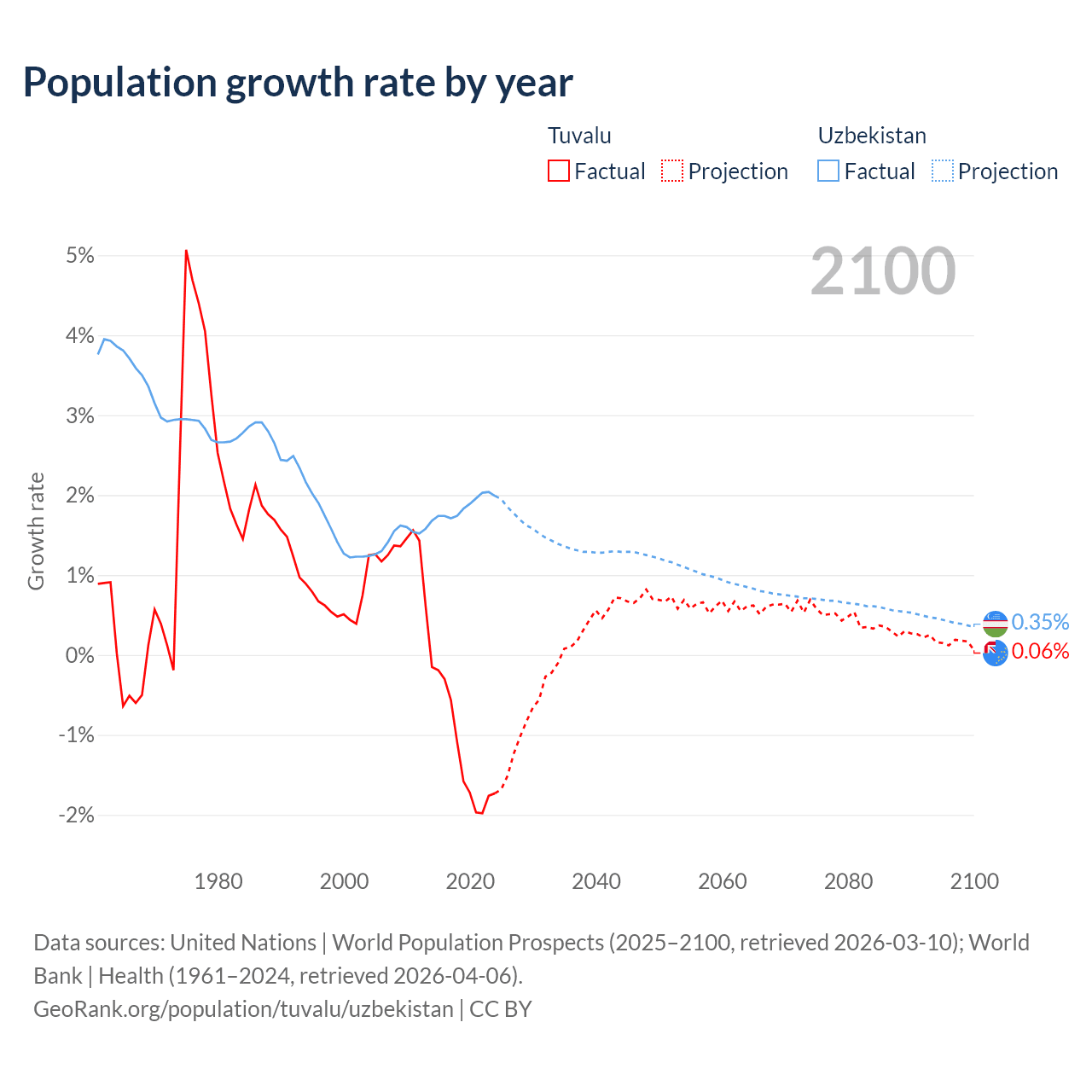 - For the last 10 years, Tuvalu has had an average growth rate of -1.19% per year vs +1.85% in Uzbekistan.