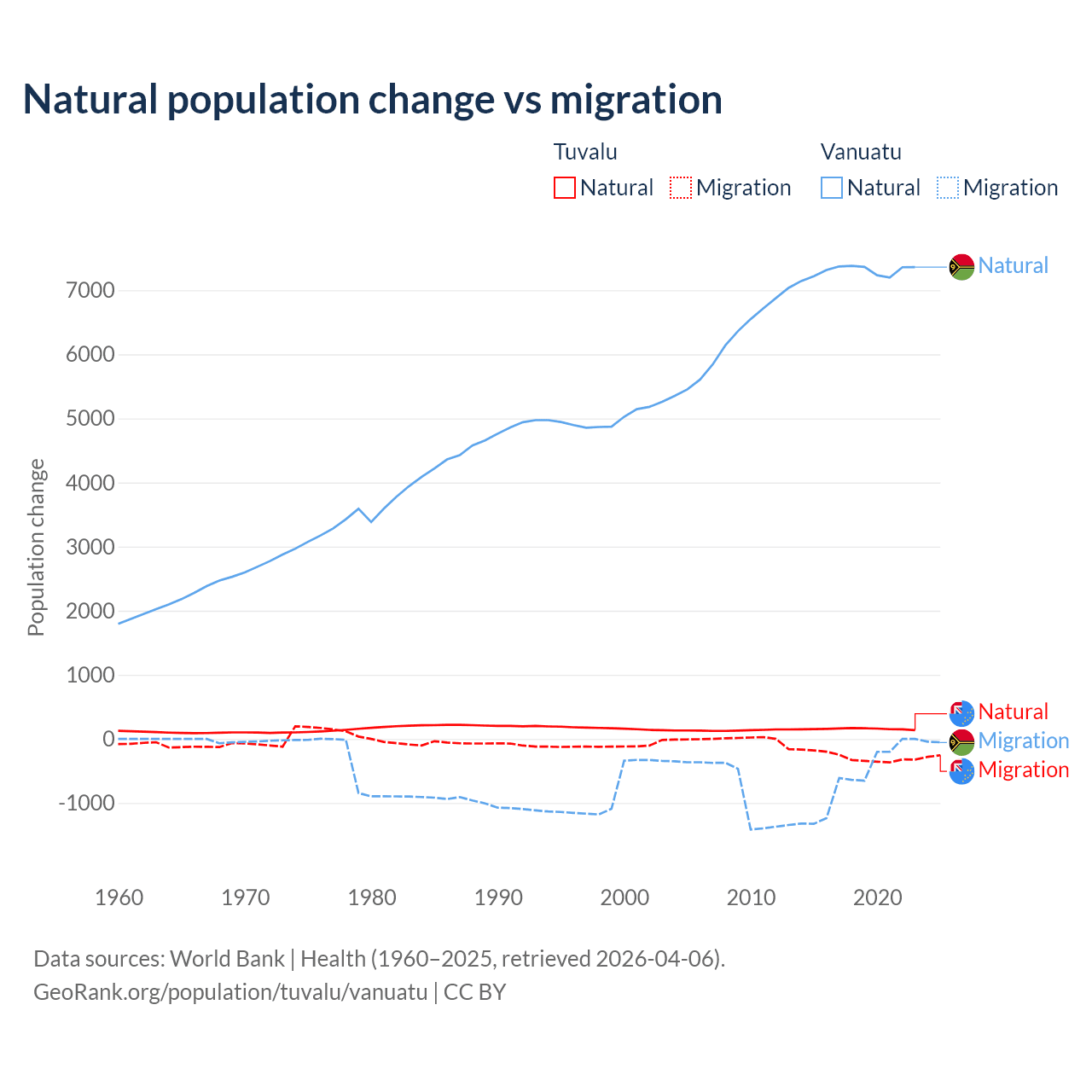 Over the last 10 years, 35.5% of the population change in Tuvalu is from natural causes (a gain of 1,556 people) and 64.5% is from migration (a loss of 2,827 people). In Vanuatu 92.2% is from natural causes (a gain of 72,941 people) and 7.81% is from migration (a loss of 6,181 people).