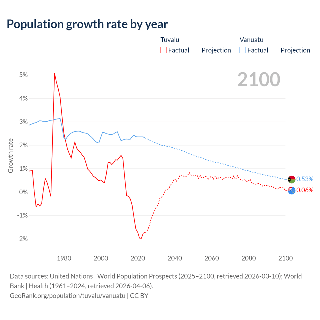 - For the last 10 years, Tuvalu has had an average growth rate of -1.19% per year vs +2.33% in Vanuatu.