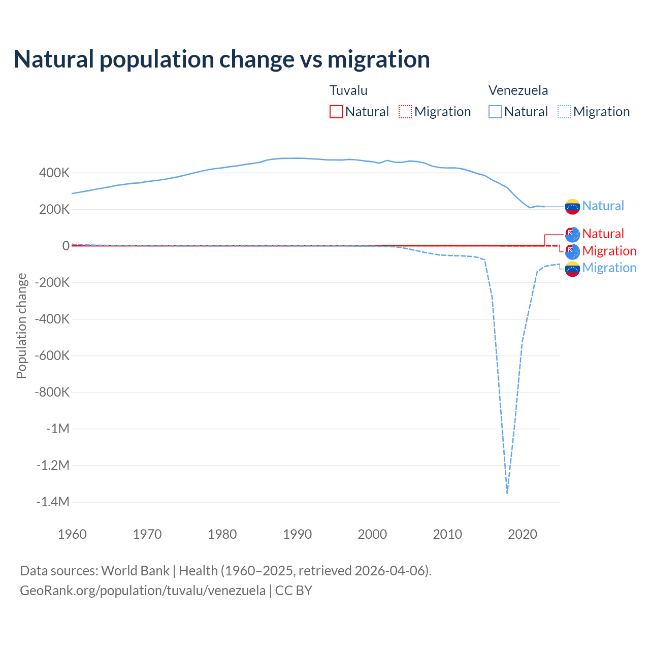 Over the last 10 years, 35.5% of the population change in Tuvalu is from natural causes (a gain of 1,556 people) and 64.5% is from migration (a loss of 2,827 people). In Venezuela 38.6% is from natural causes (a gain of 2,946,257 people) and 61.4% is from migration (a loss of 4,683,227 people).