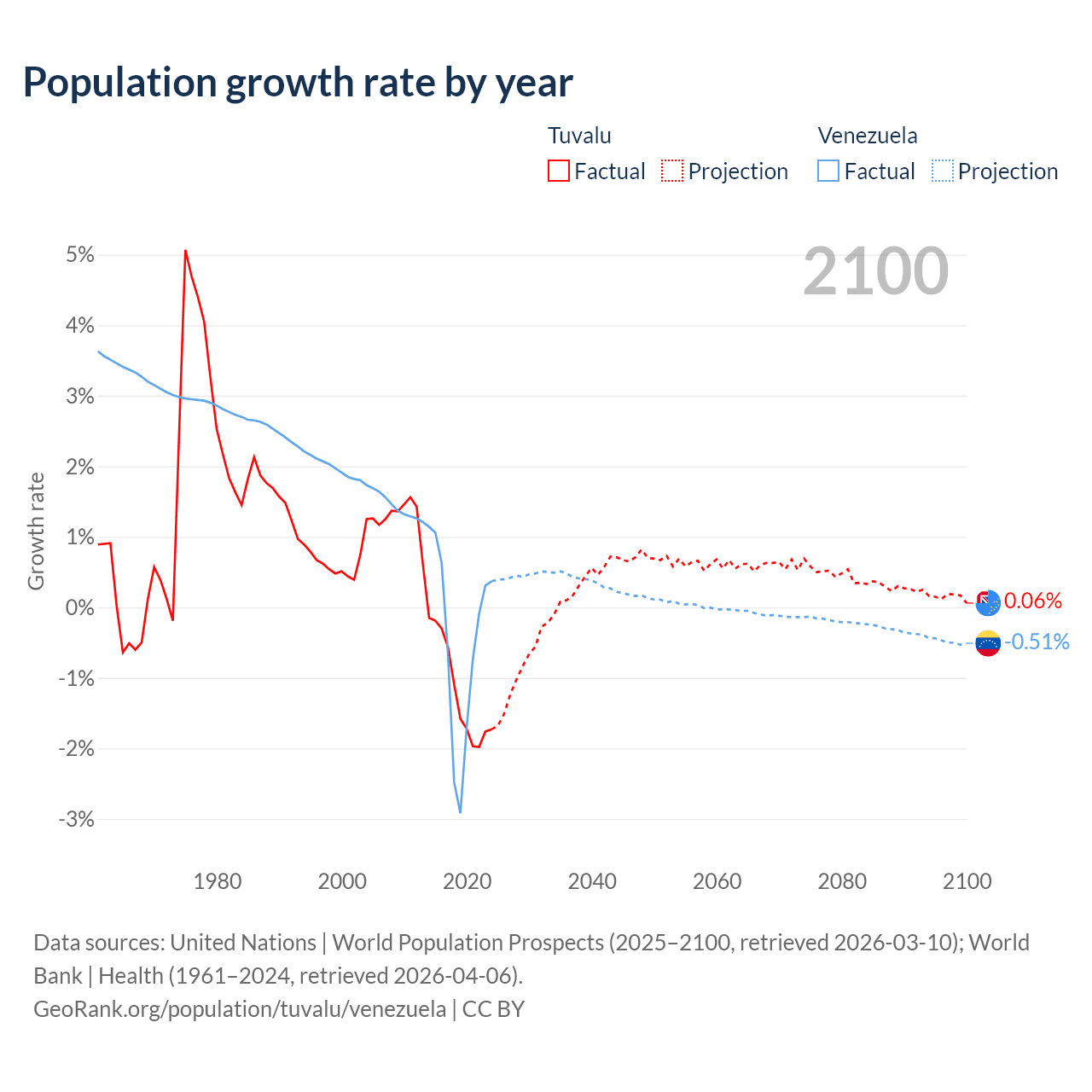 - For the last 10 years, Tuvalu has had an average growth rate of -1.19% per year vs -0.46% in Venezuela.