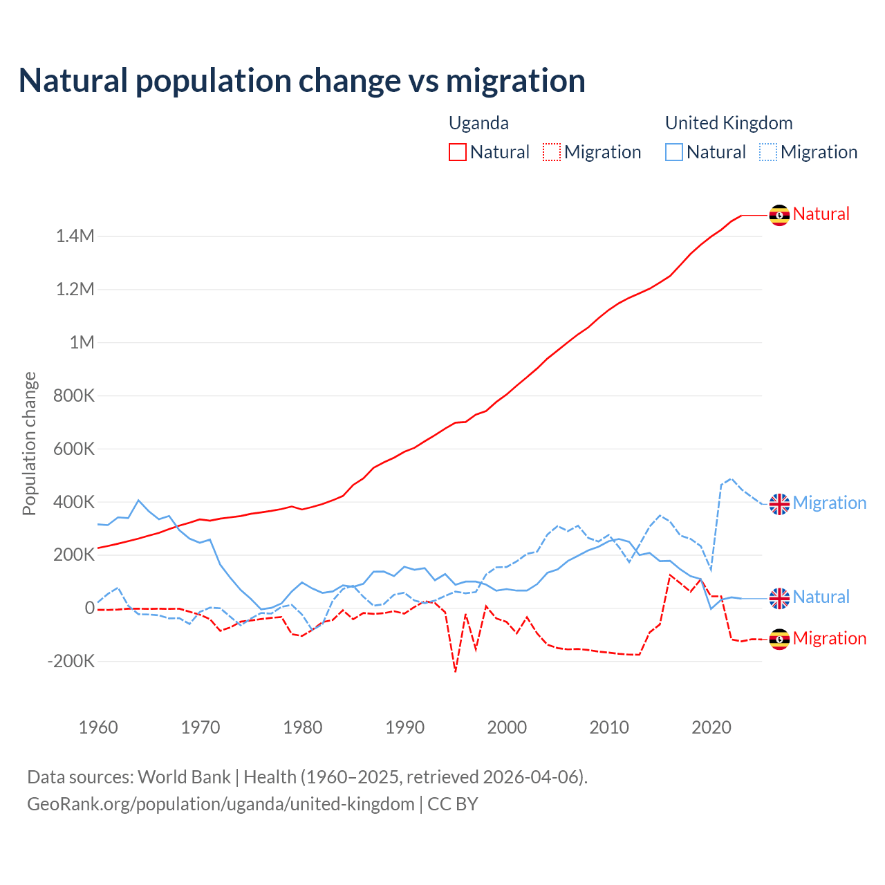 Over the last 10 years, 99.5% of the population change in Uganda is from natural causes (a gain of 13,419,712 people) and 0.53% is from migration (a gain of 71,457 people). In the United Kingdom 23.9% is from natural causes (a gain of 1,033,129 people) and 76.1% is from migration (a gain of 3,283,101 people).