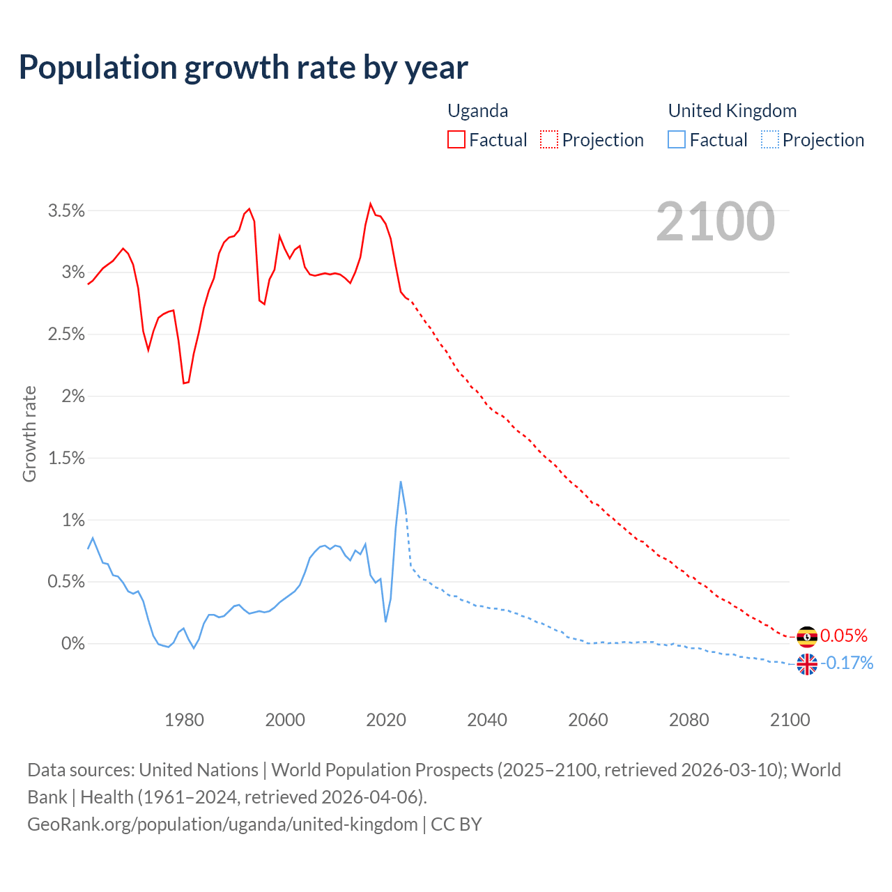 - For the last 10 years, Uganda has had an average growth rate of +3.21% per year vs +0.7% in the United Kingdom.