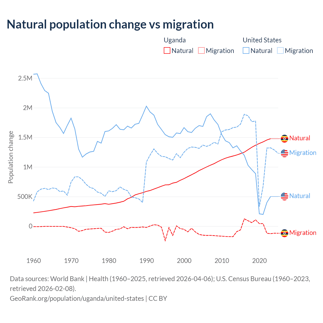 Over the last 10 years, 99.5% of the population change in Uganda is from natural causes (a gain of 13,419,712 people) and 0.53% is from migration (a gain of 71,457 people). In the United States 35.8% is from natural causes (a gain of 8,005,866 people) and 64.2% is from migration (a gain of 14,334,286 people).