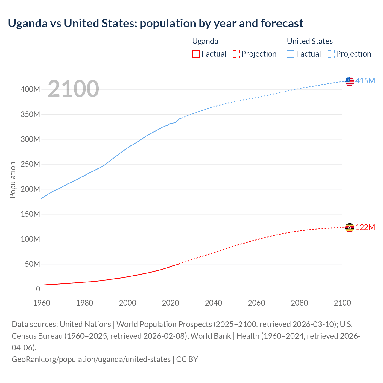 The latest officially reported population of Uganda was 50,015,092 in 2024 vs 341,784,857 people in the United States in 2025. In 2026, based on the adjusted UN estimation, the current Uganda's population is 53,170,946 people compared to 344,023,146 in the United States.
