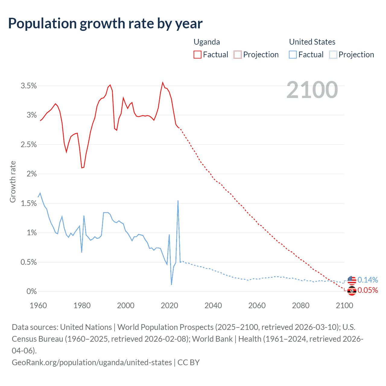 - For the last 10 years, Uganda has had an average growth rate of +3.21% per year vs +0.65% in the United States.
