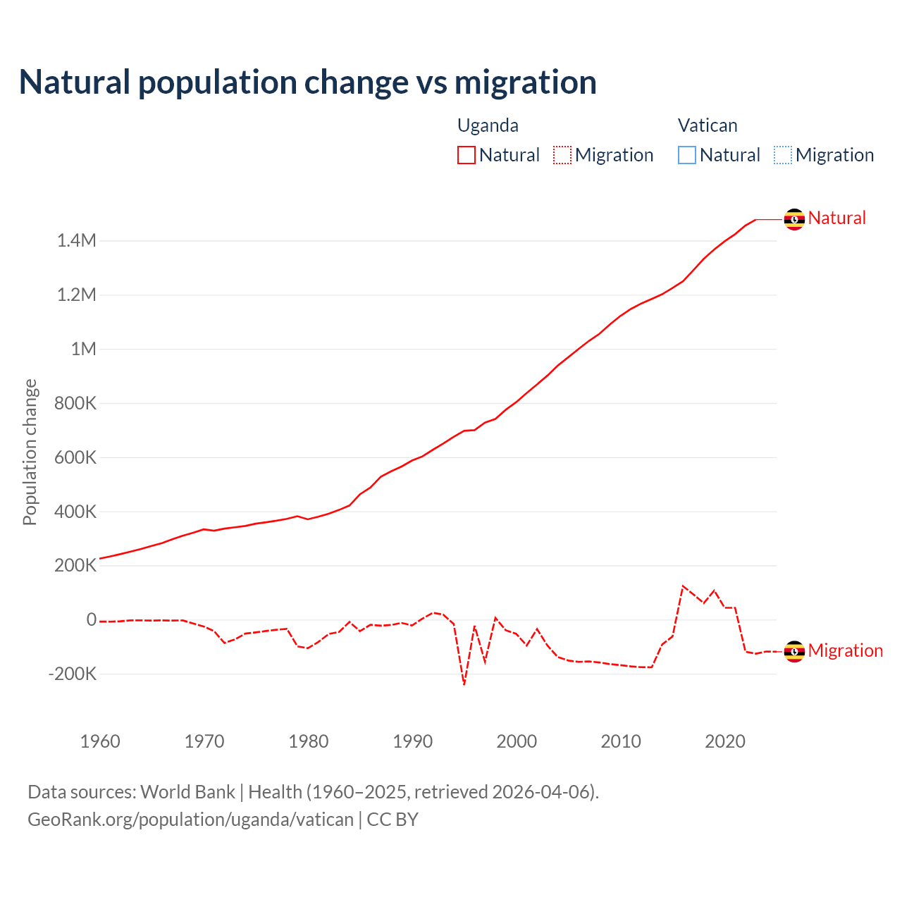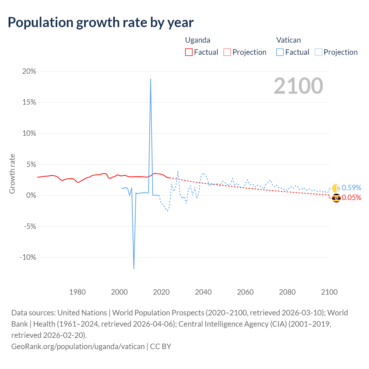 - For the last 10 years, Uganda has had an average growth rate of +3.21% per year vs +1.9% in the Vatican.