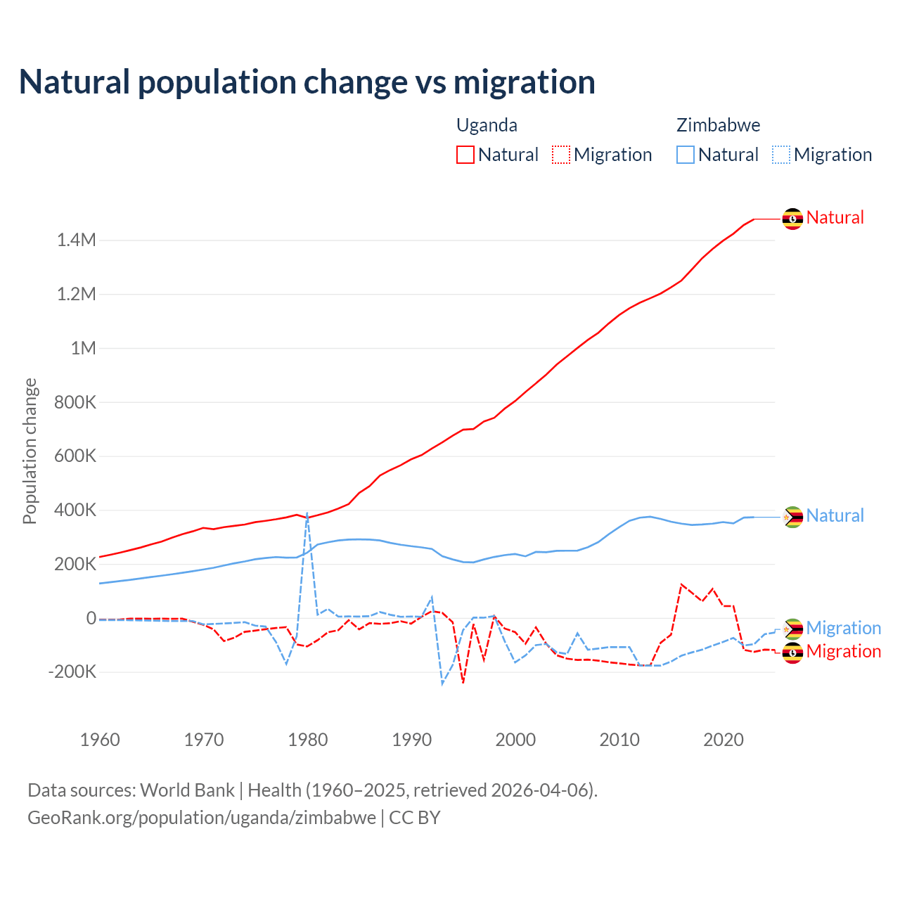 Over the last 10 years, 99.5% of the population change in Uganda is from natural causes (a gain of 13,419,712 people) and 0.53% is from migration (a gain of 71,457 people). In Zimbabwe 74.9% is from natural causes (a gain of 3,558,487 people) and 25.1% is from migration (a loss of 1,192,807 people).