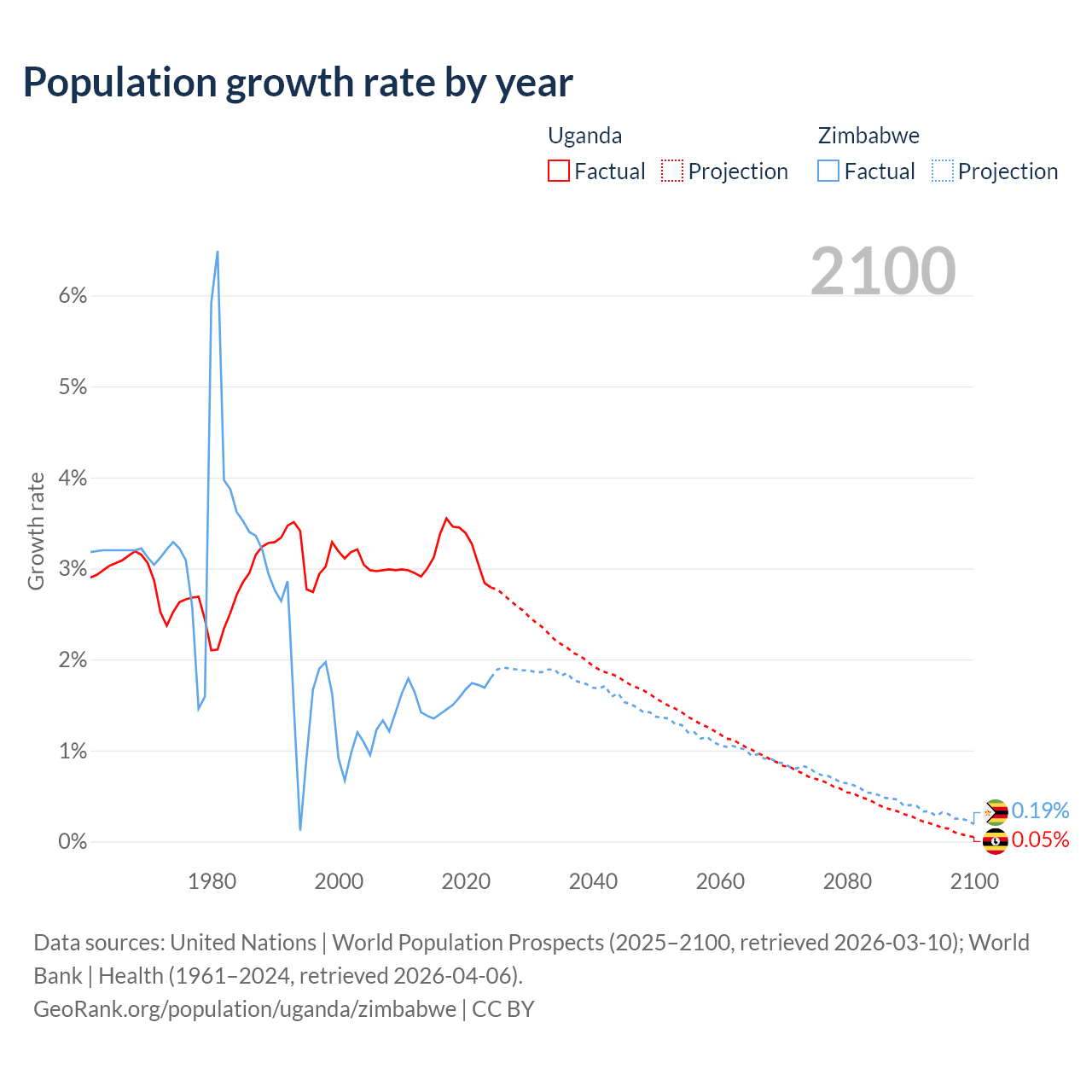 - For the last 10 years, Uganda has had an average growth rate of +3.21% per year vs +1.57% in Zimbabwe.