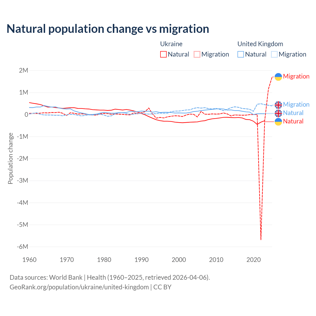 Over the last 10 years, 28.2% of the population change in Ukraine is from natural causes (a loss of 2,435,153 people) and 71.8% is from migration (a loss of 6,198,995 people). In the United Kingdom 23.9% is from natural causes (a gain of 1,033,129 people) and 76.1% is from migration (a gain of 3,283,101 people).