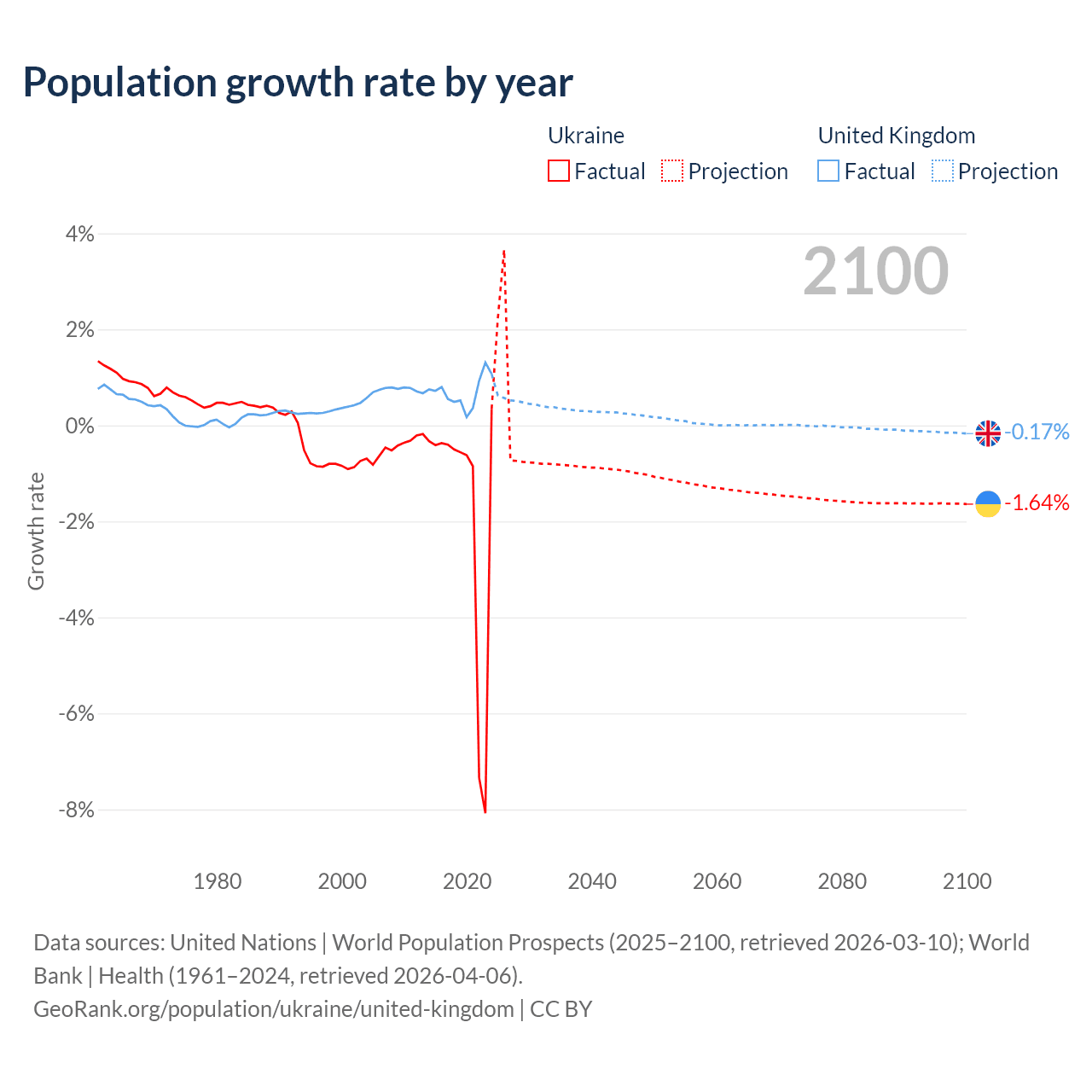- For the last 10 years, Ukraine has had an average growth rate of -1.74% per year vs +0.7% in the United Kingdom.