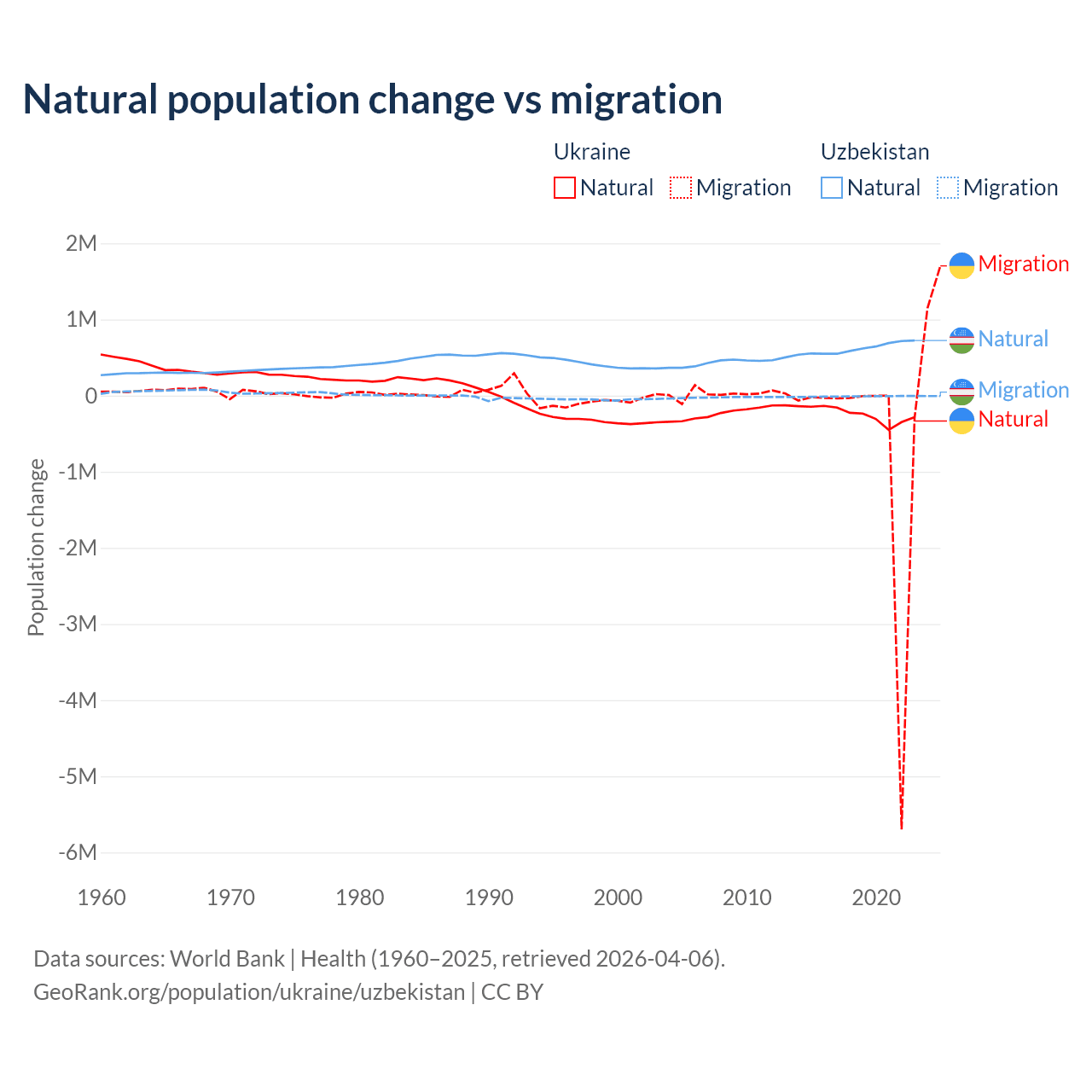 Over the last 10 years, 28.2% of the population change in Ukraine is from natural causes (a loss of 2,435,153 people) and 71.8% is from migration (a loss of 6,198,995 people). In Uzbekistan 98.2% is from natural causes (a gain of 6,161,117 people) and 1.84% is from migration (a loss of 115,398 people).