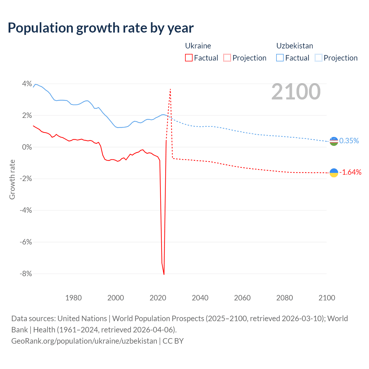 - For the last 10 years, Ukraine has had an average growth rate of -1.74% per year vs +1.85% in Uzbekistan.