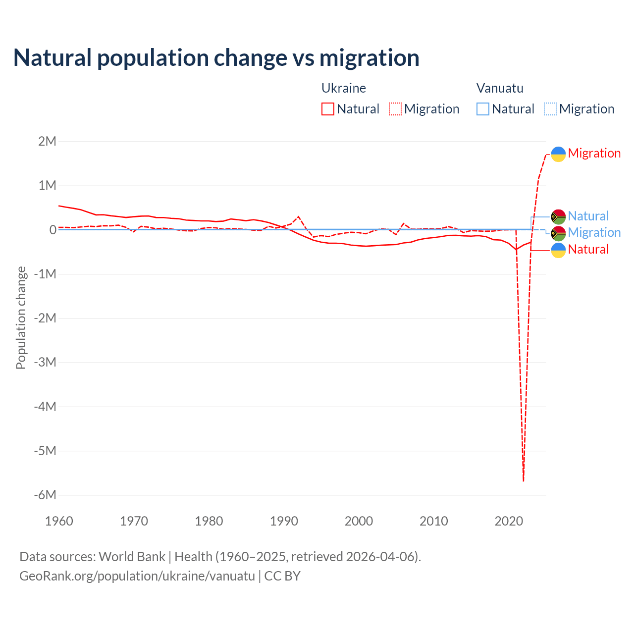 Over the last 10 years, 28.2% of the population change in Ukraine is from natural causes (a loss of 2,435,153 people) and 71.8% is from migration (a loss of 6,198,995 people). In Vanuatu 92.2% is from natural causes (a gain of 72,941 people) and 7.81% is from migration (a loss of 6,181 people).