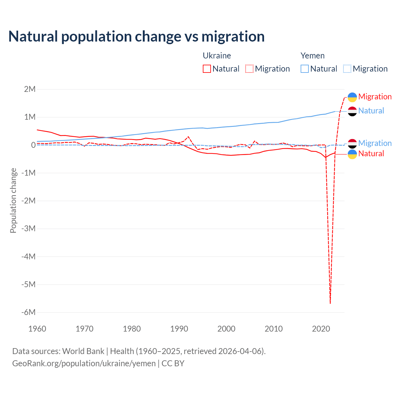 Over the last 10 years, 28.2% of the population change in Ukraine is from natural causes (a loss of 2,435,153 people) and 71.8% is from migration (a loss of 6,198,995 people). In Yemen 97.8% is from natural causes (a gain of 10,460,813 people) and 2.17% is from migration (a loss of 231,814 people).