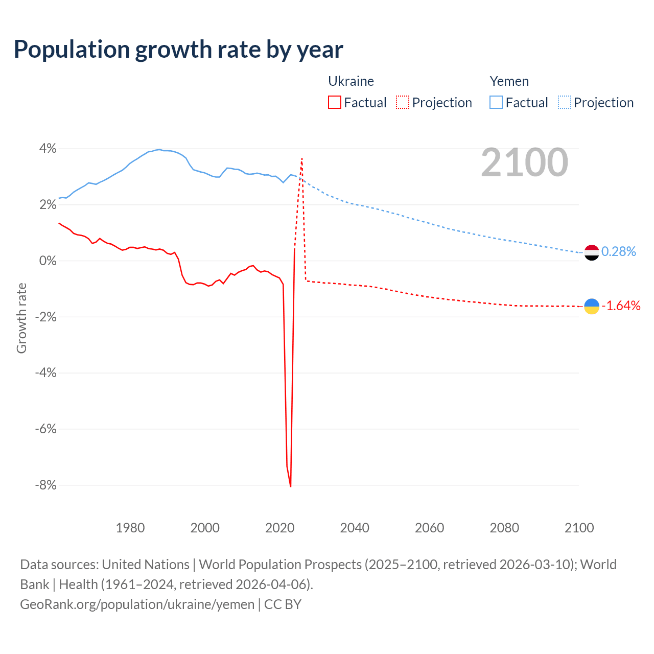 - For the last 10 years, Ukraine has had an average growth rate of -1.74% per year vs +3% in Yemen.