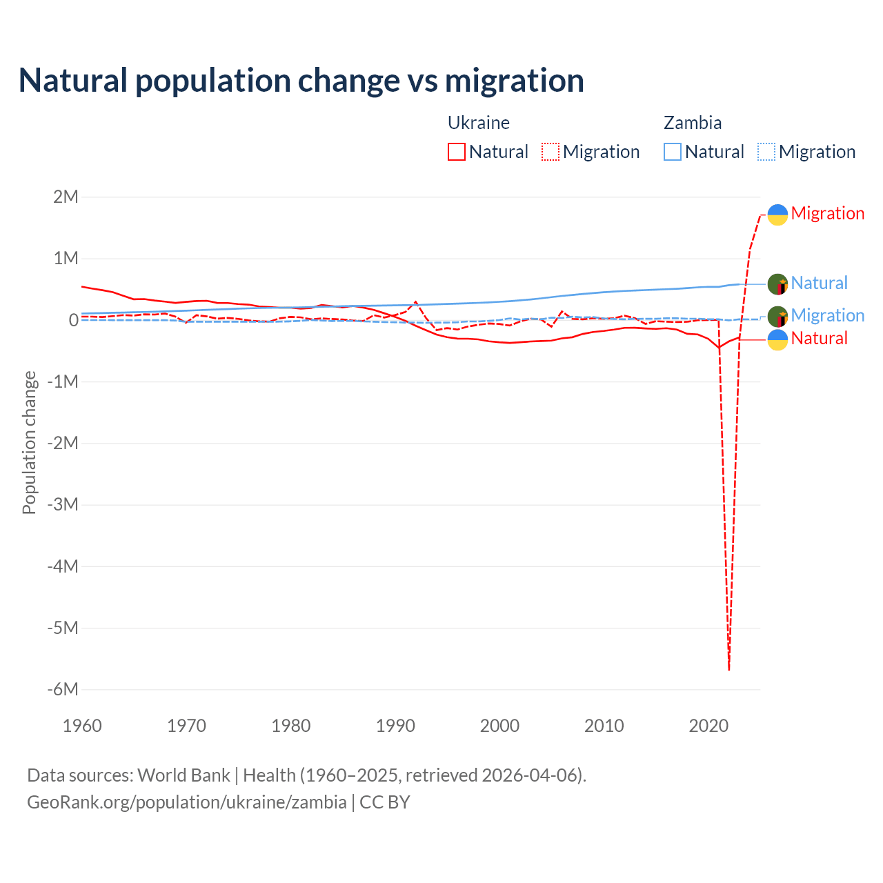 Over the last 10 years, 28.2% of the population change in Ukraine is from natural causes (a loss of 2,435,153 people) and 71.8% is from migration (a loss of 6,198,995 people). In Zambia 97.4% is from natural causes (a gain of 5,233,797 people) and 2.58% is from migration (a gain of 138,554 people).