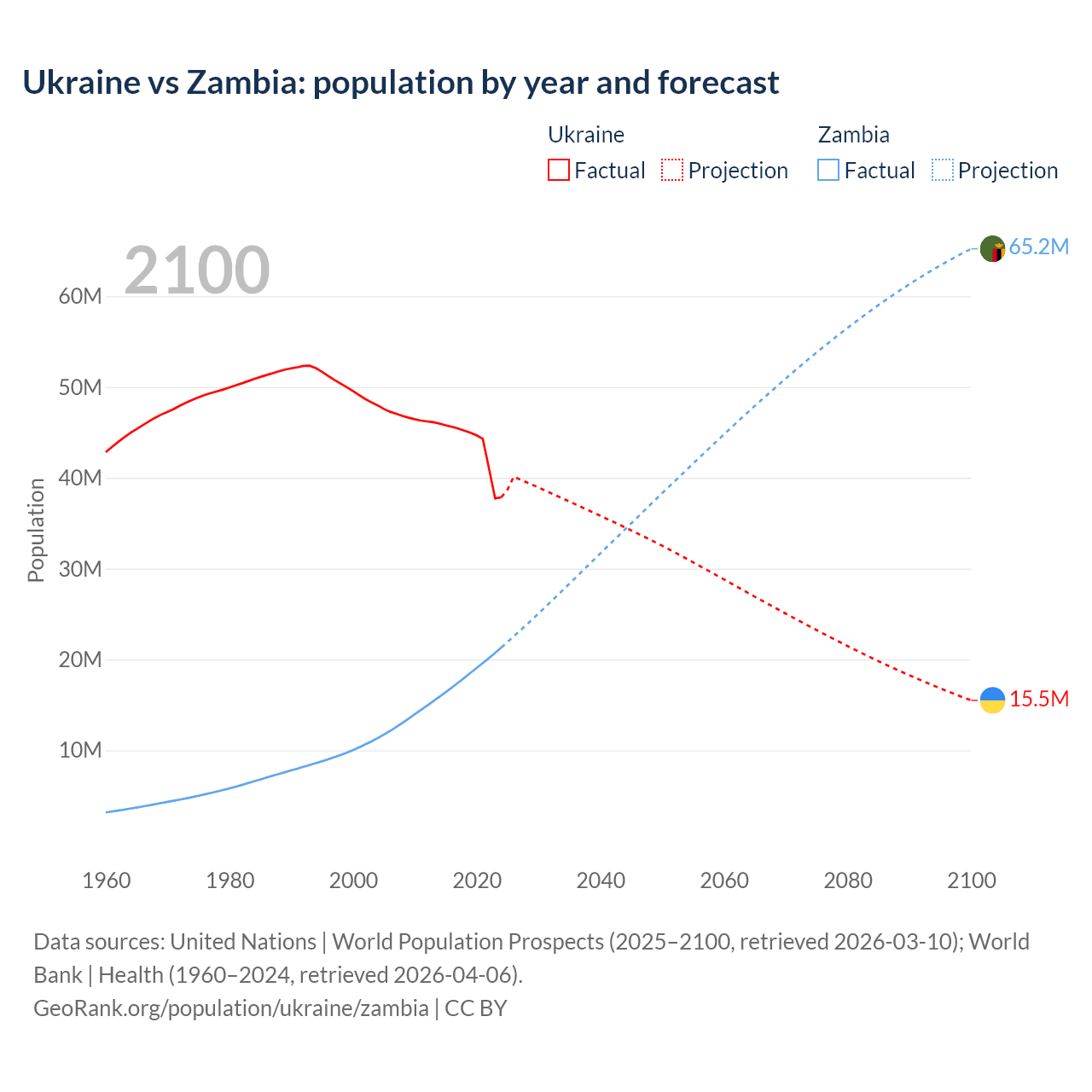 The latest officially reported population of Ukraine was 37,860,221 in 2024 vs 21,314,956 people in Zambia in 2024. In 2026, based on the adjusted UN estimation, the current Ukraine's population is 40,125,599 people compared to 22,697,916 in Zambia.