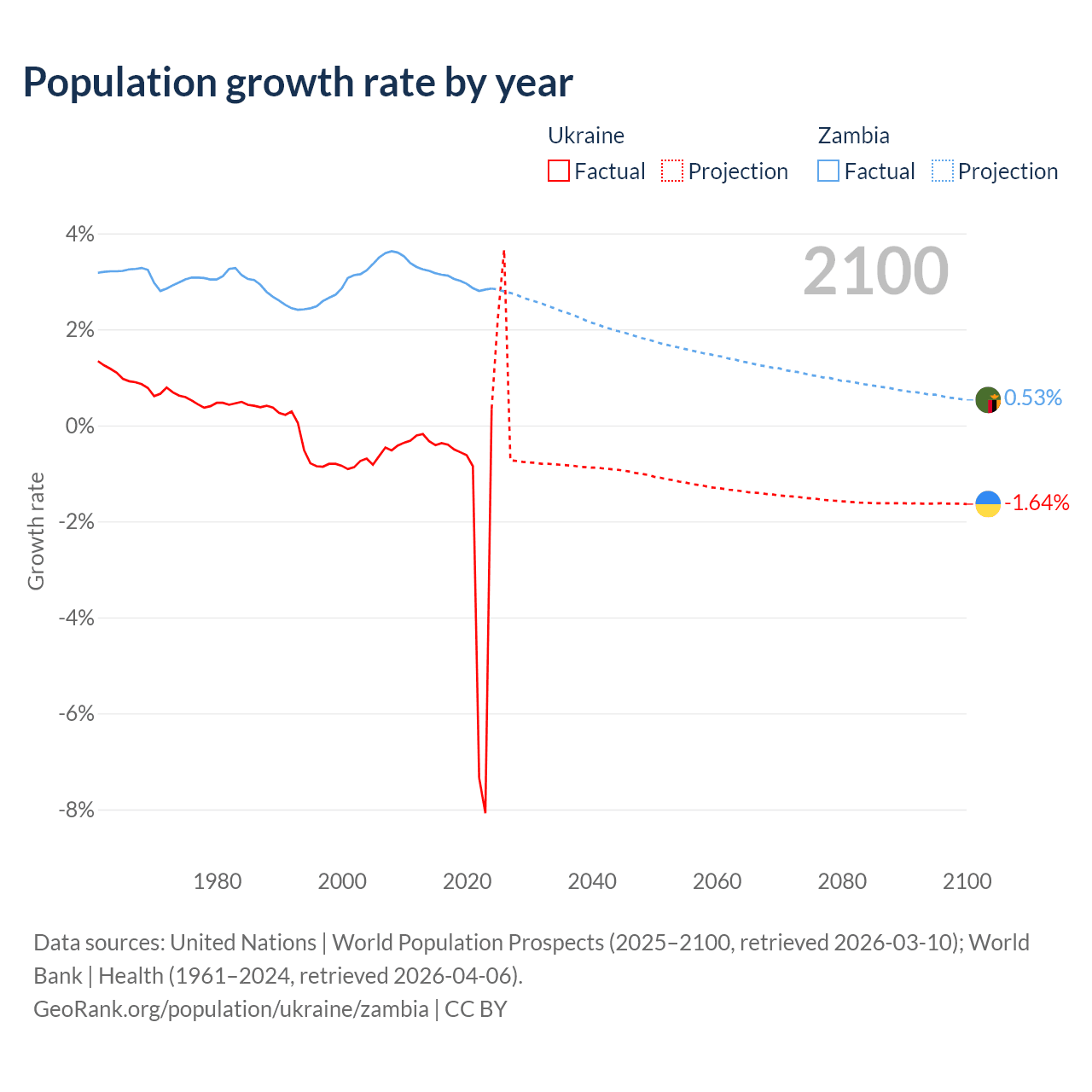 - For the last 10 years, Ukraine has had an average growth rate of -1.74% per year vs +3% in Zambia.