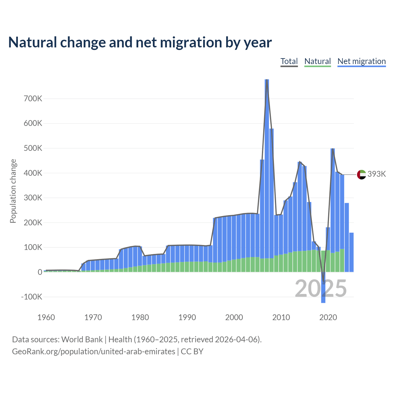 Over the last 10 years, 30.5% of the population change in the United Arab Emirates is from natural causes (a gain of 857,996 people) and 69.5% is from migration (a gain of 1,958,520 people).