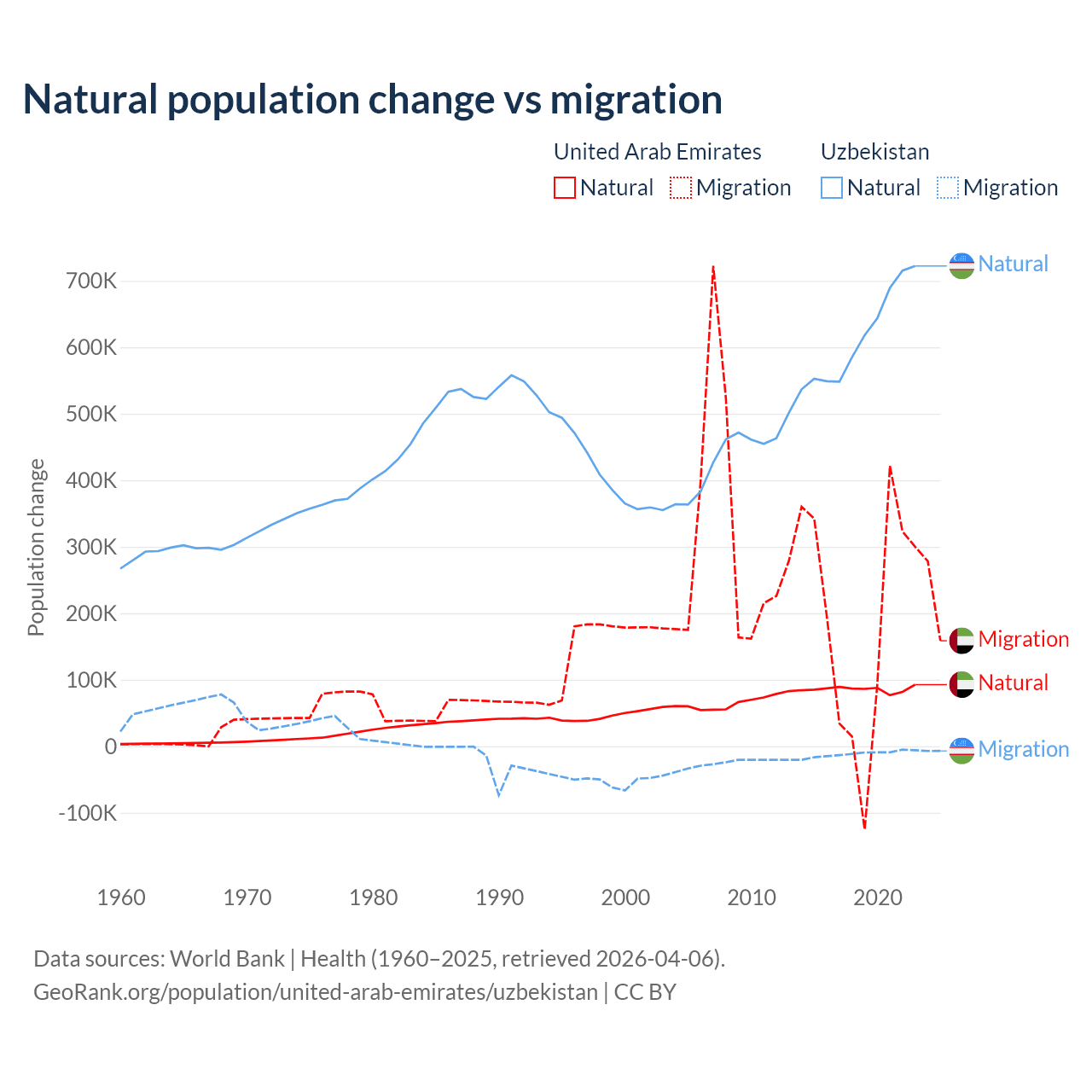 Over the last 10 years, 30.5% of the population change in the United Arab Emirates is from natural causes (a gain of 857,996 people) and 69.5% is from migration (a gain of 1,958,520 people). In Uzbekistan 98.2% is from natural causes (a gain of 6,161,117 people) and 1.84% is from migration (a loss of 115,398 people).