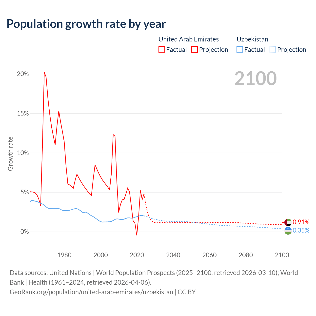 - For the last 10 years, the United Arab Emirates has had an average growth rate of +3.31% per year vs +1.85% in Uzbekistan.